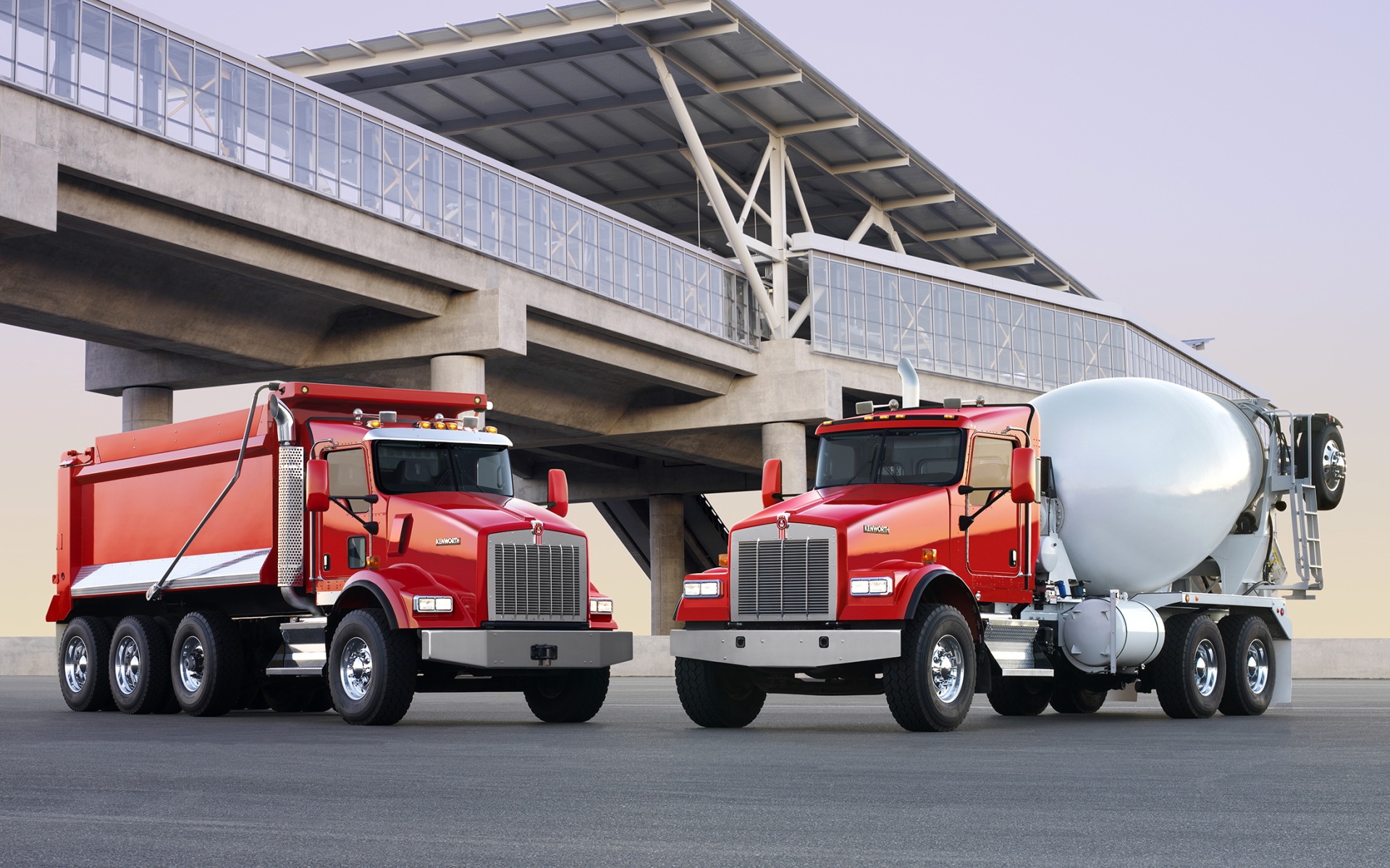Description: Two red trucks parked next to each other under a bridge and a building with a walkway above them and a concrete walkway above them.