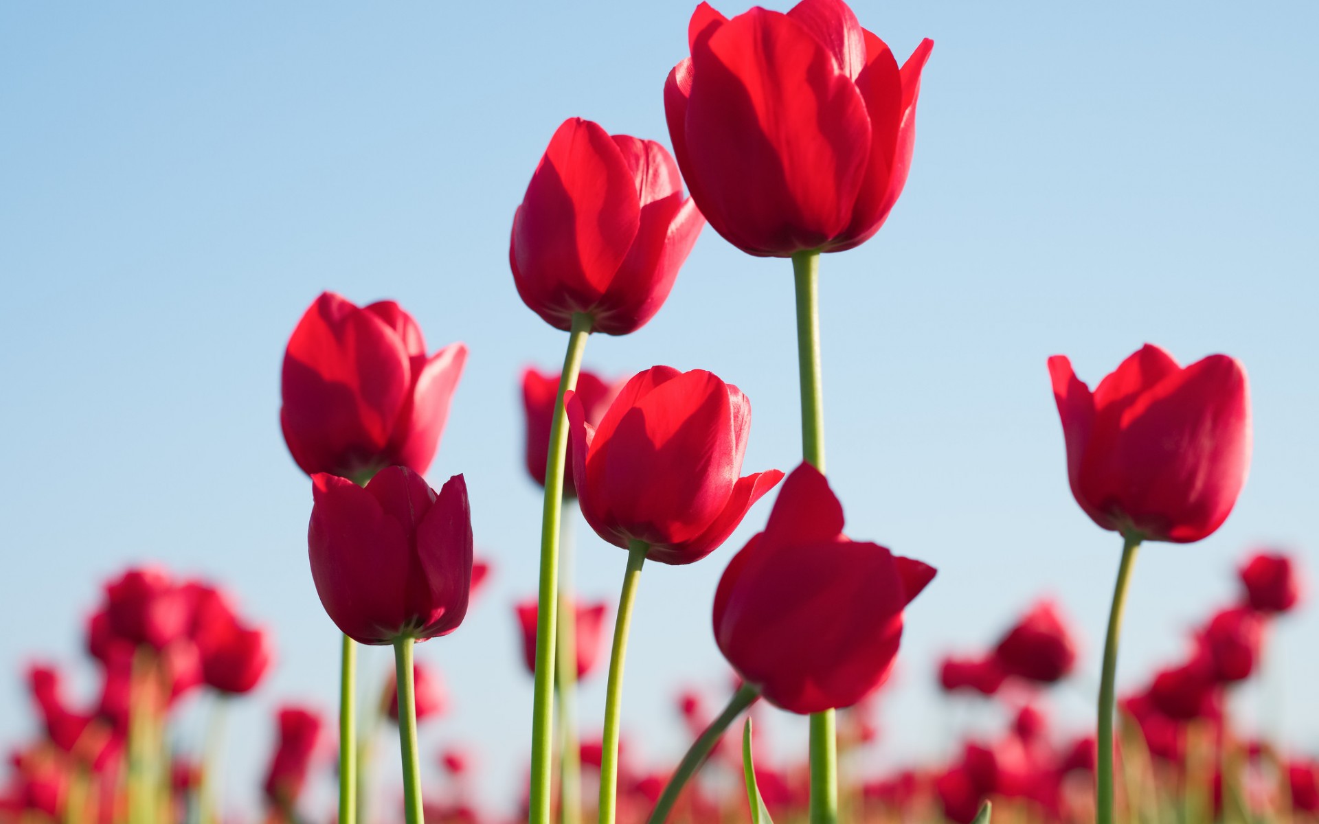 Description: A field of red tulips with a blue sky in the background and a few green stems in the foreground.