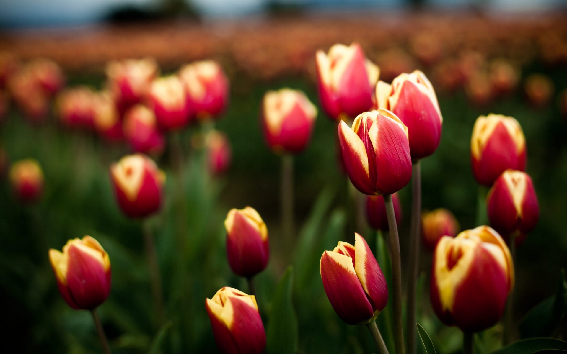 Description: A field of red and yellow tulips with a sky background in the background.