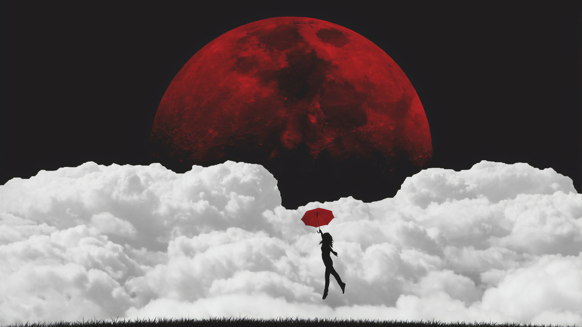 Description: A person holding a red umbrella standing on a cloud covered hill with a red moon in the background of the sky.