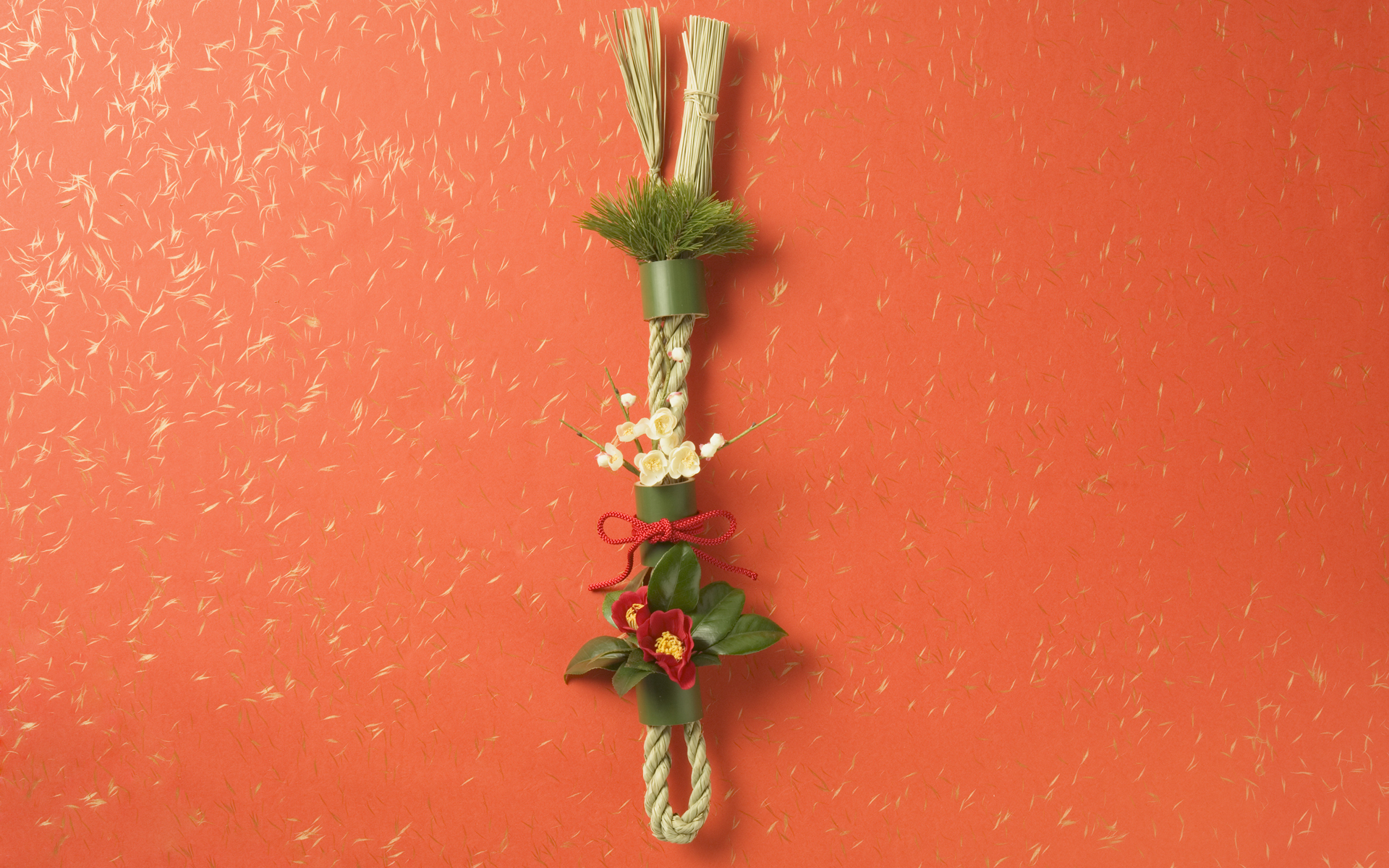 Description: A red wall with a green and white flower arrangement on it and a green and white flower arrangement on the wall.