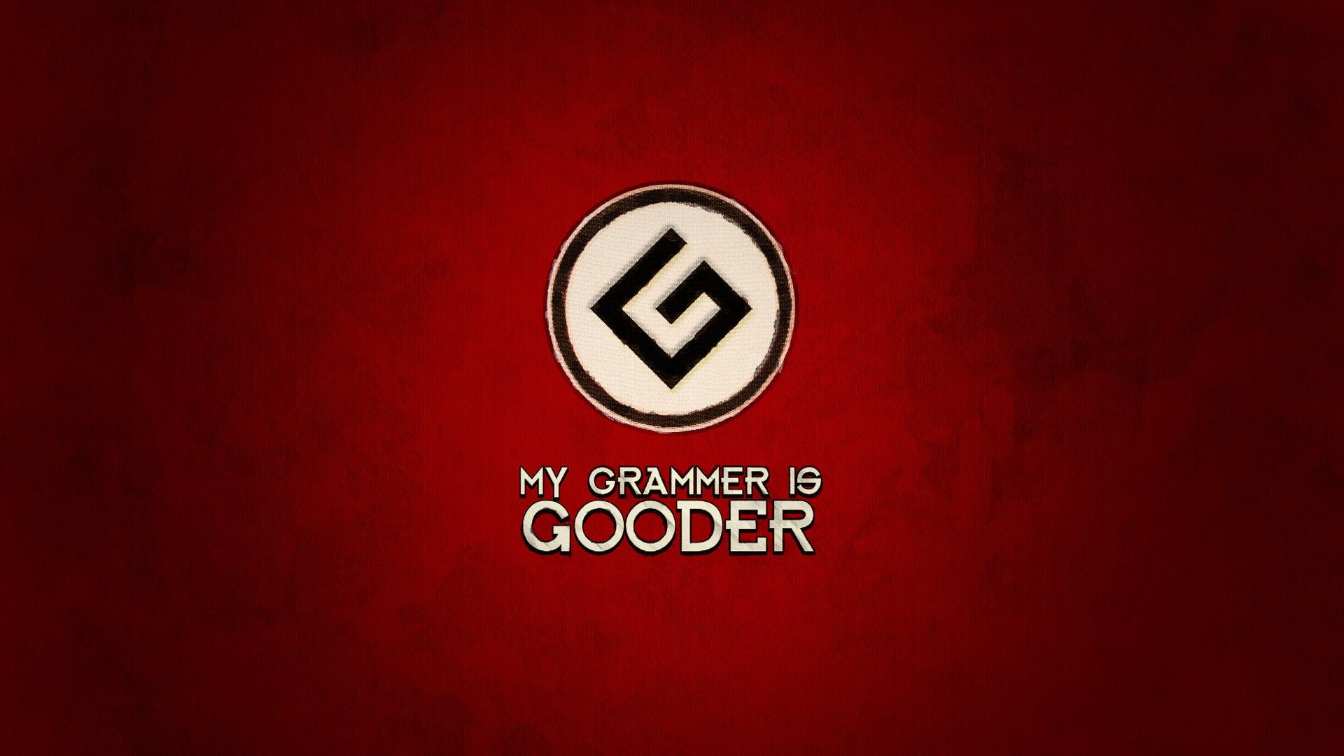 Description: A red wall with a black and white logo on it and a red background with a white and black circle with a black and white letter.