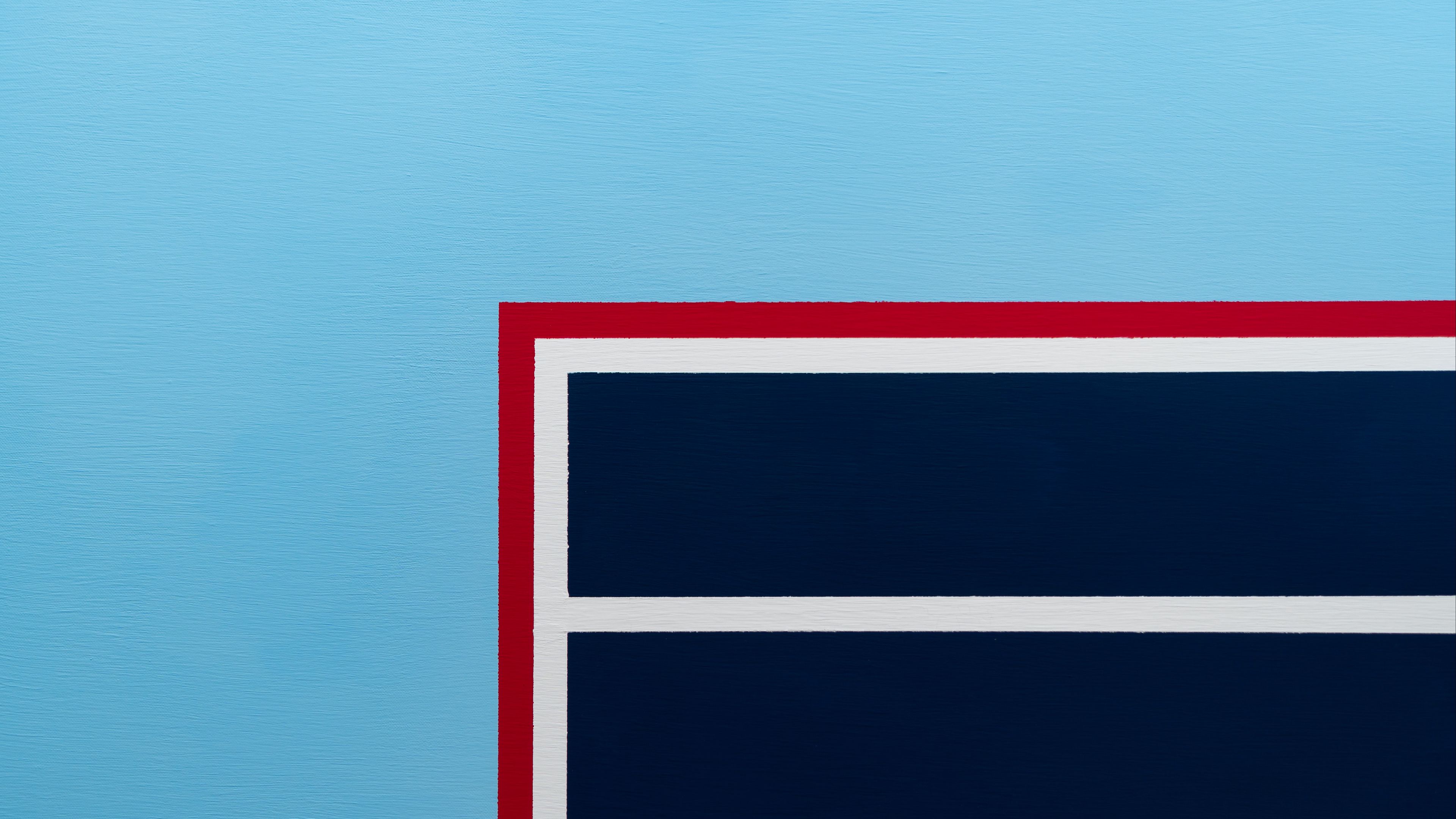 Description: A painting of a red white and blue window on a blue wall with a blue background and a red and white stripe.