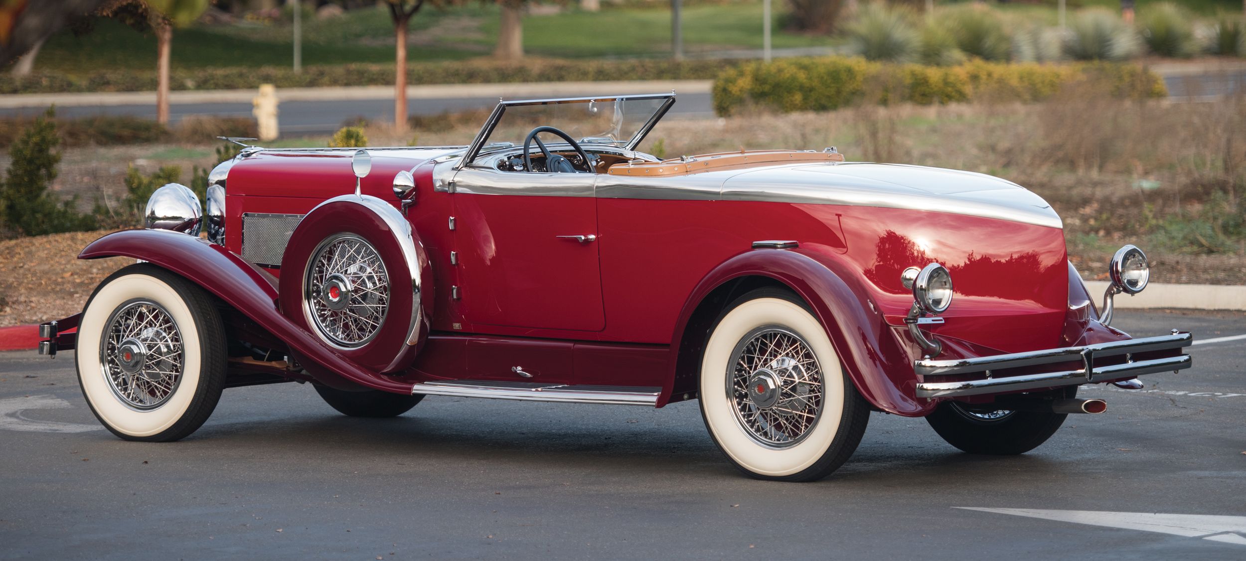 Description: A red and white car parked in a parking lot next to a tree and bushes in the background with a red and white stripe.