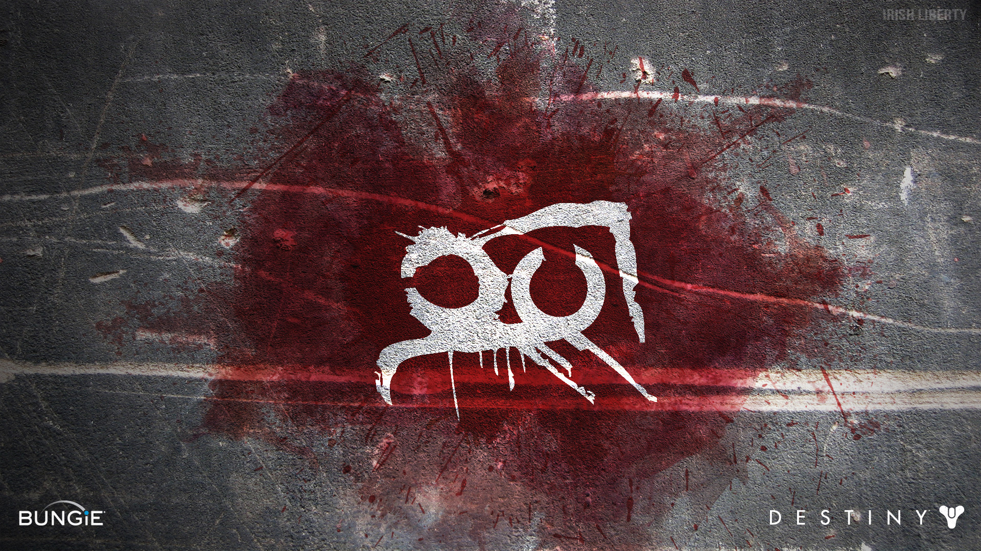 Description: A picture of a red and white logo on a wall with a red and white paint splattered on it.