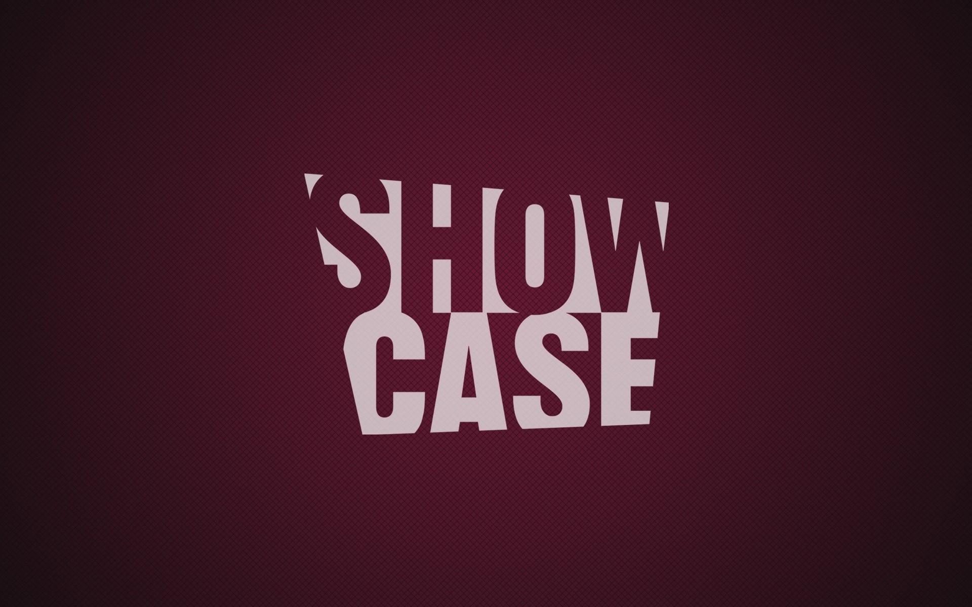 Description: A red and white poster with the words show case on it's side and a white text that reads show case.