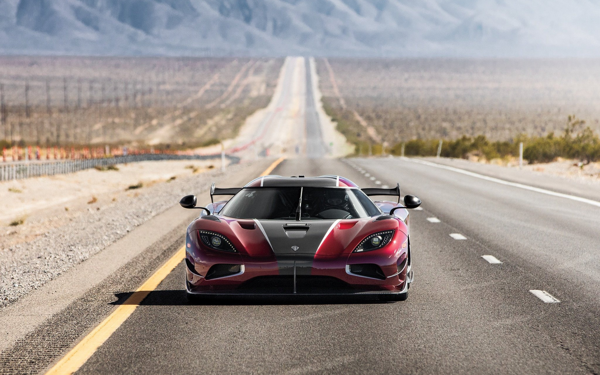 Description: A red and white sports car driving down a road in the desert with mountains in the background and a sky background.