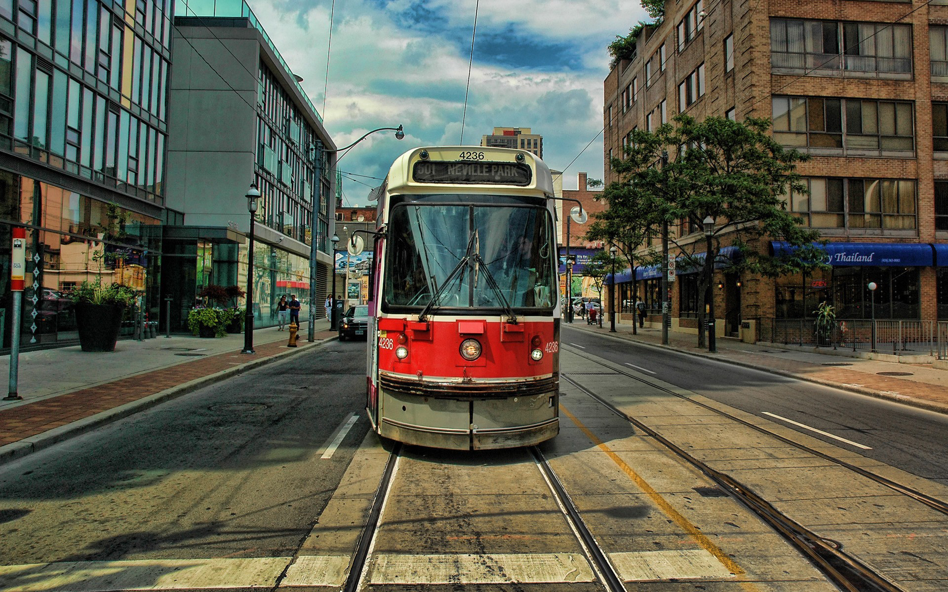 Description: A red and white train traveling down a street next to tall buildings and tall buildings on either side of a street.