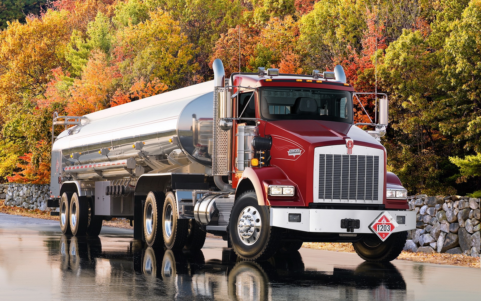 Description: A red and white truck driving down a road next to a forest of trees with fall colors on the trees.