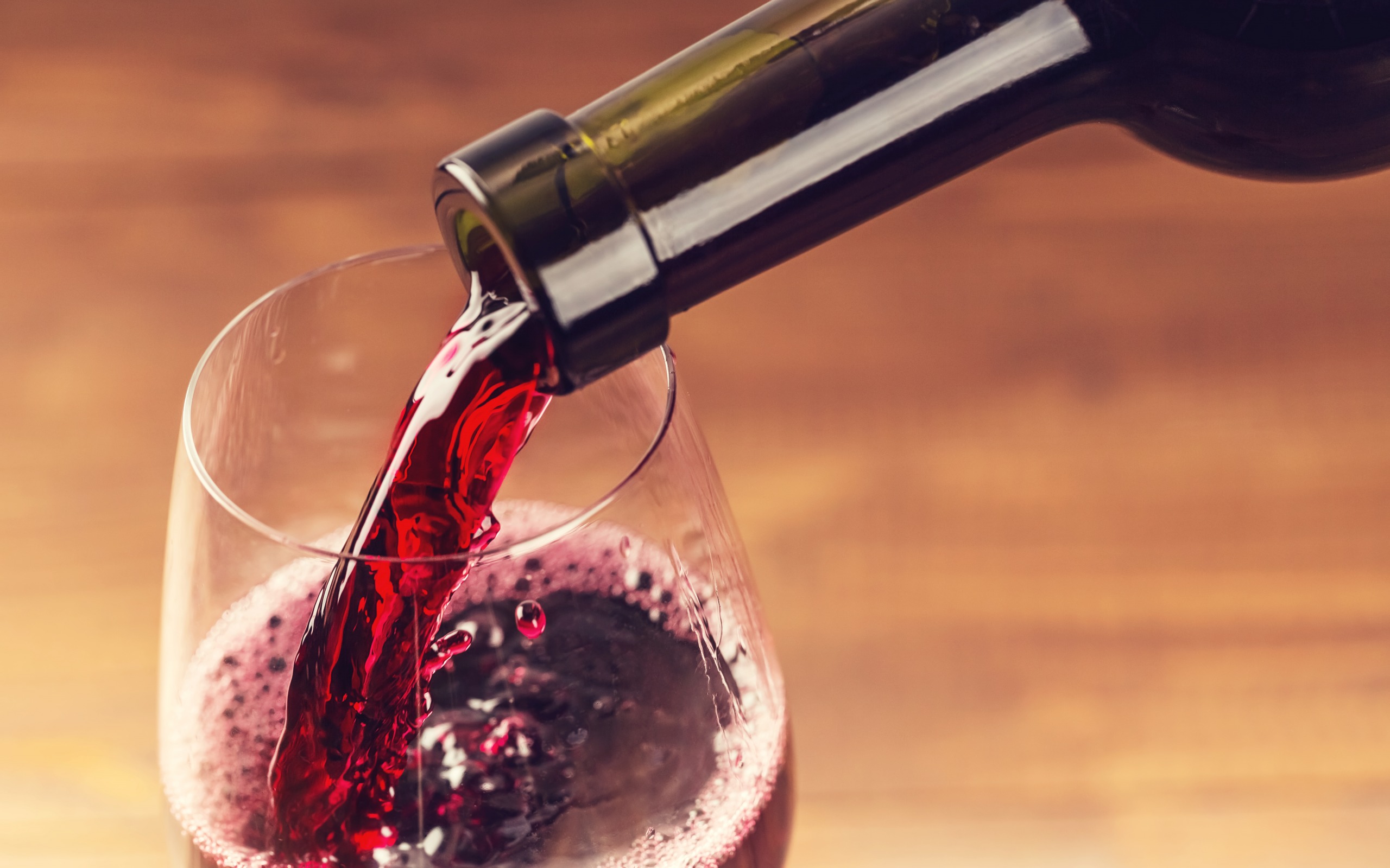 Description: A glass of red wine being poured into it with a bottle of wine in the background on a wooden table.