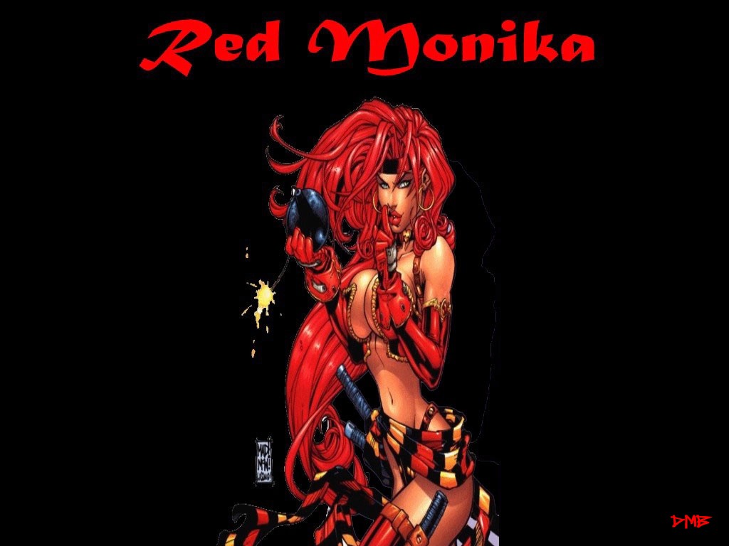 Description: A red woman with a gun in her hand and a black background with the words red monka on it.