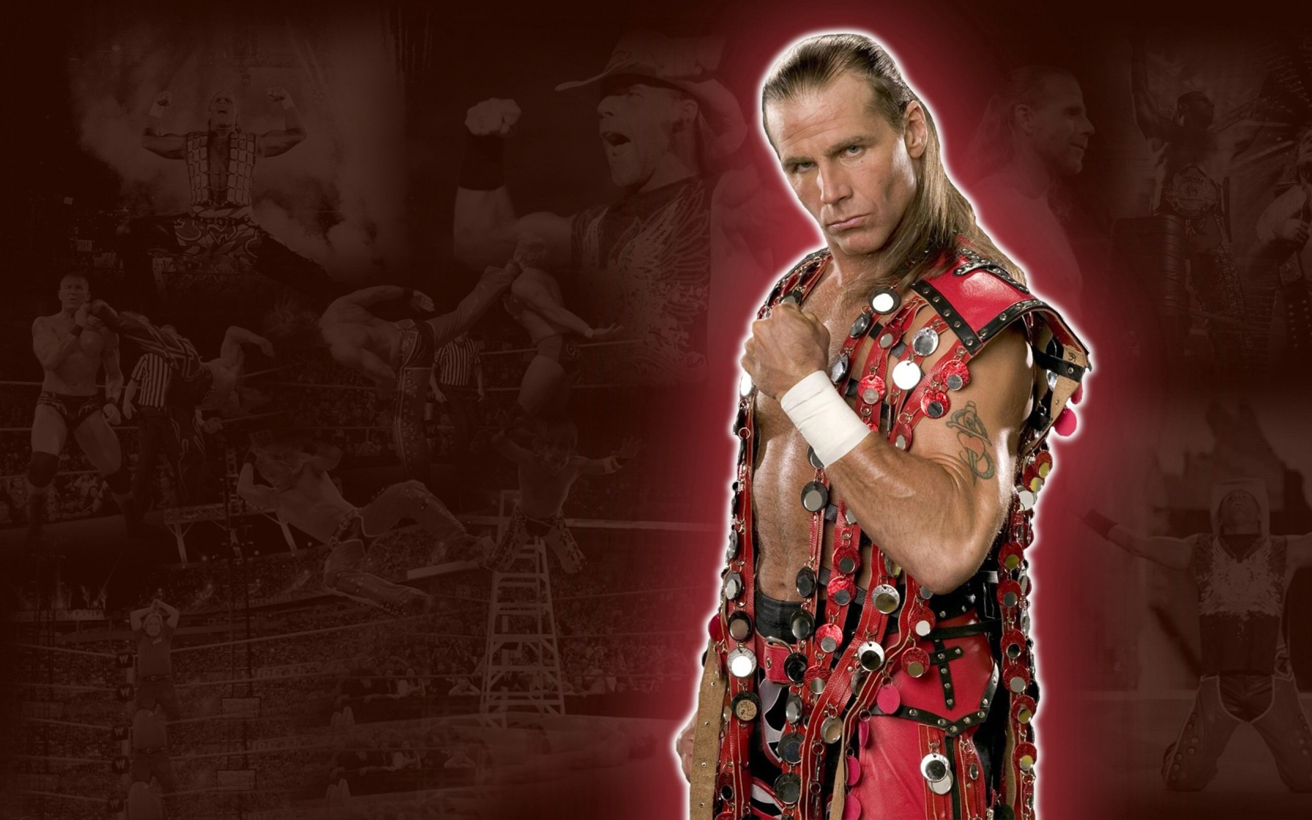 Description: A man in a red wrestling outfit with a red belt and a red shirt and a red hat and a red background.