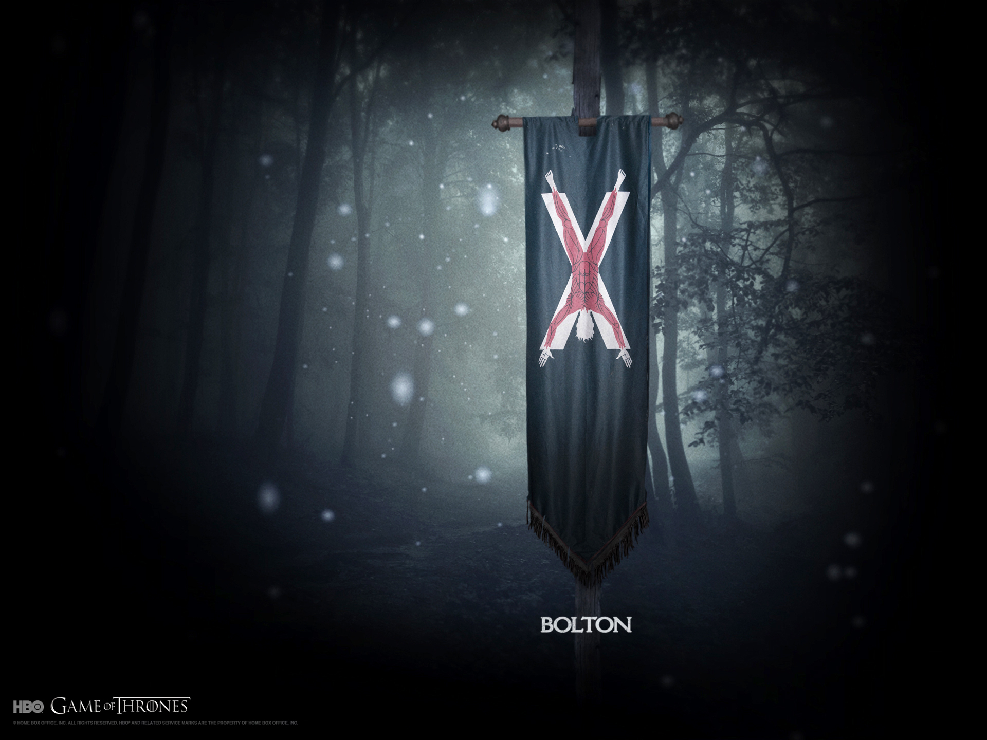Description: A banner with a red x on it in the woods with snow falling around it and a dark background.