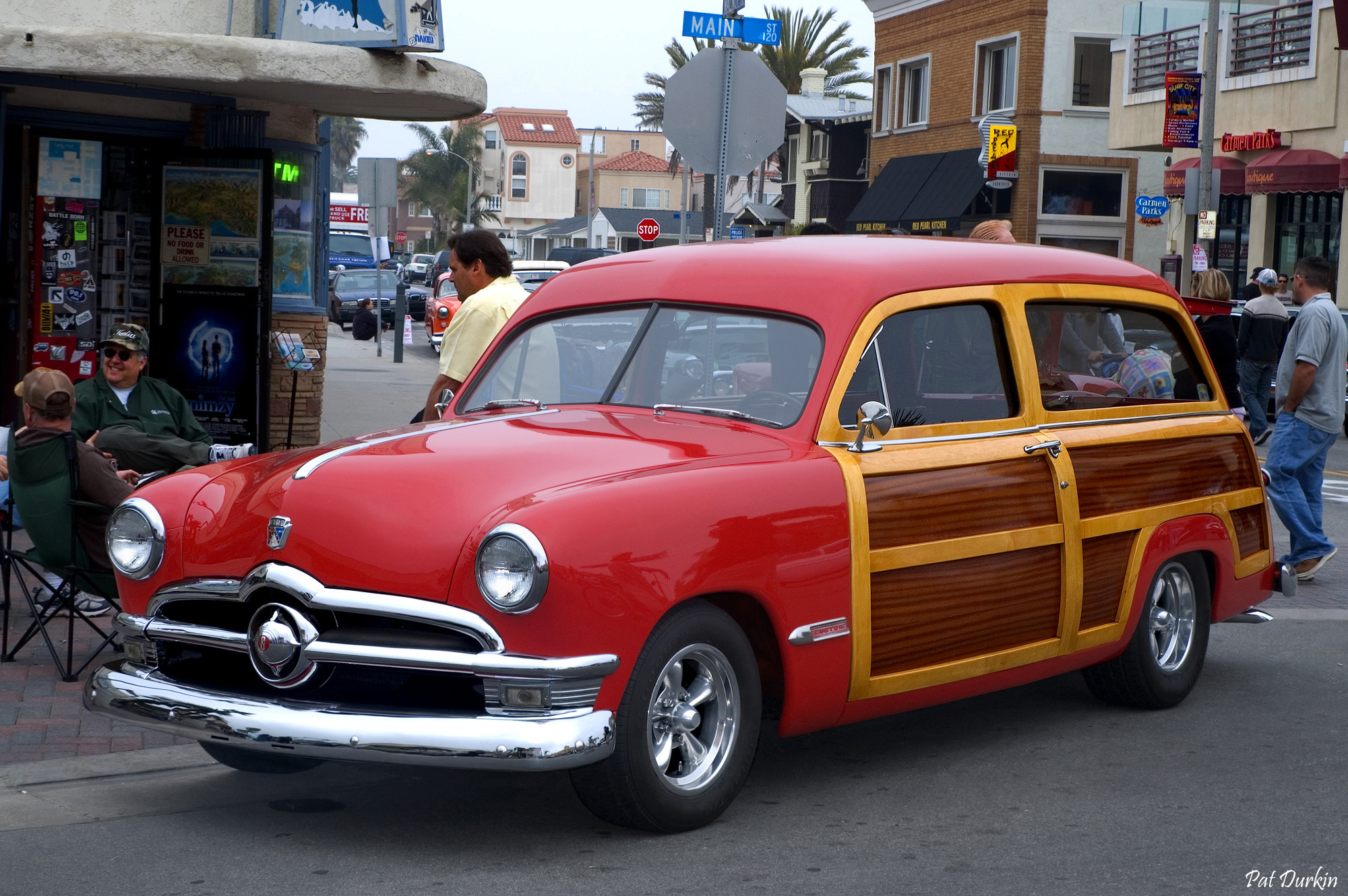 Description: A red and yellow car parked on the side of a road next to a building with people sitting at tables.