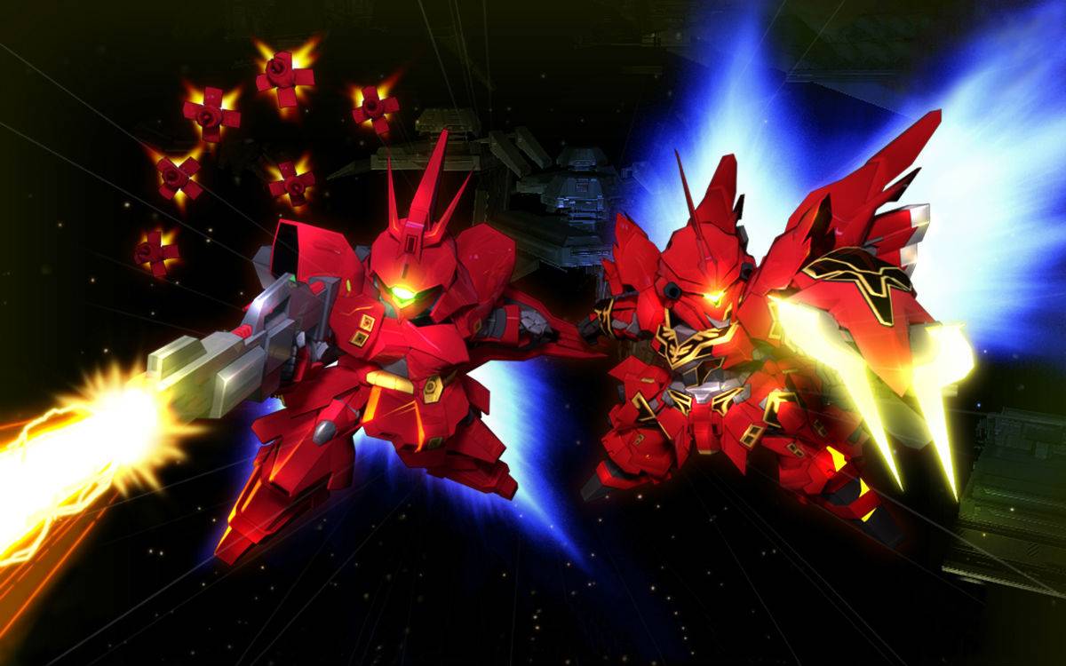 Description: A red and yellow robot fighting with a gun in front of a black background with blue and yellow lights.