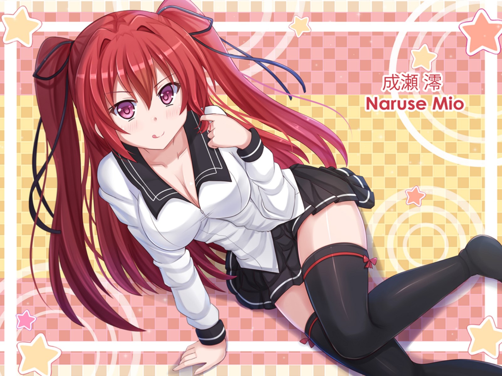 Description: A girl with long red hair and black stockings is laying on the floor with her legs crossed and her head tilted.