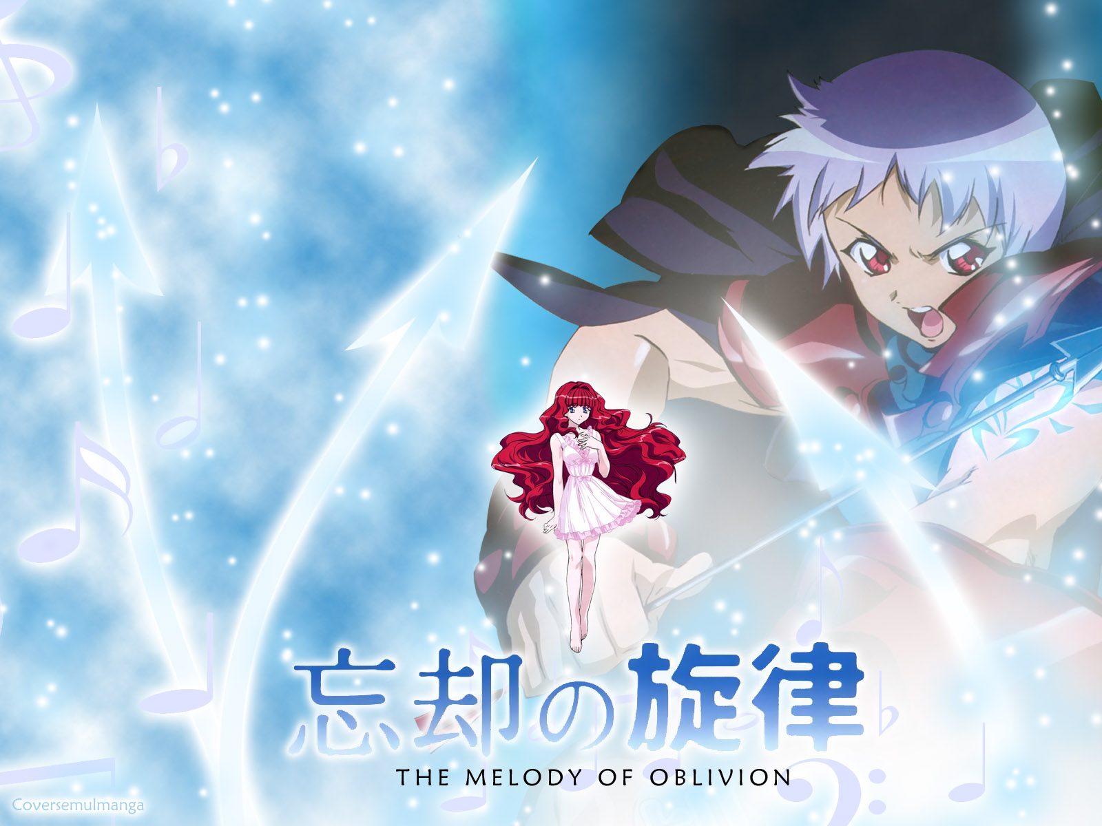 Description: A anime character with a red hair and a blue dress holding a sword in her hand and a blue background with notes.