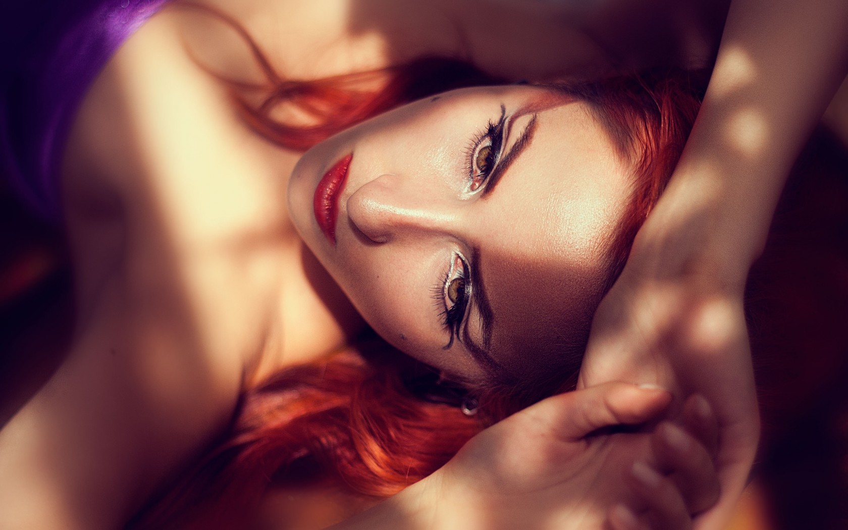 Description: A woman with red hair and blue eyes laying on a bed with her hands on her chest and her eyes closed.