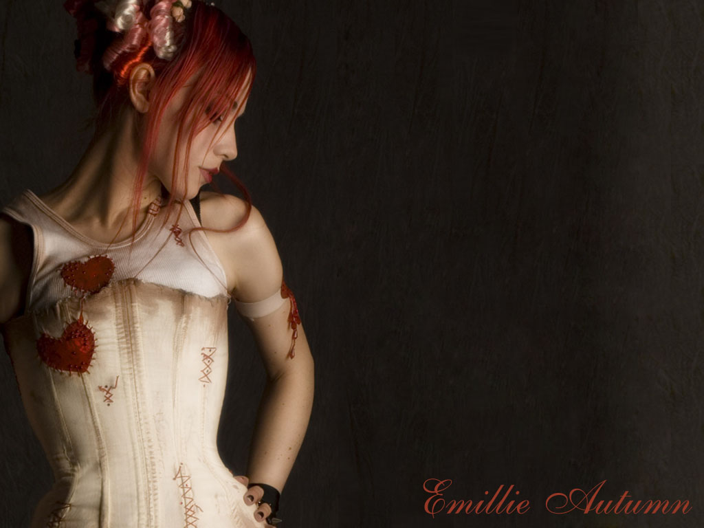 Description: A woman with red hair wearing a corset and a white dress with red flowers on it's chest.
