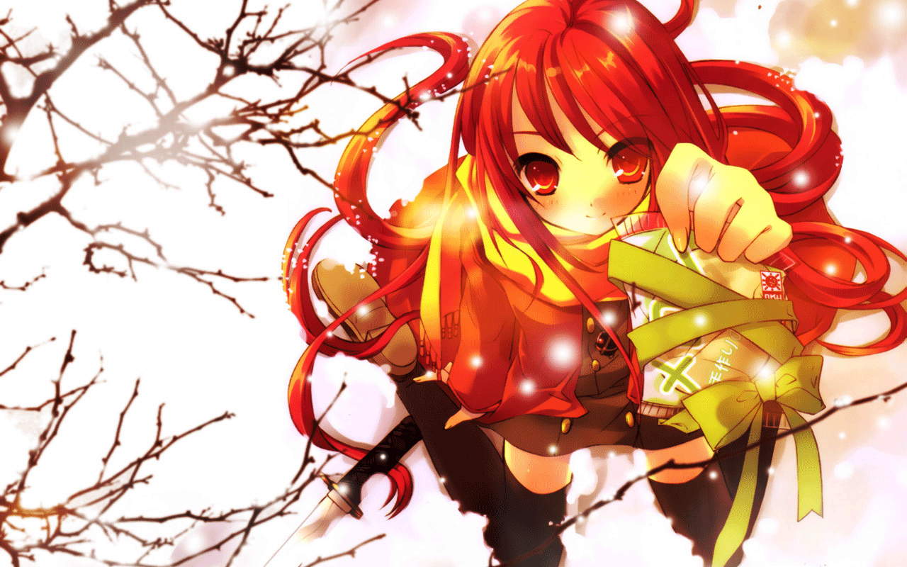 Description: A girl with red hair and a green shirt is holding a knife and pointing at something in her hand.