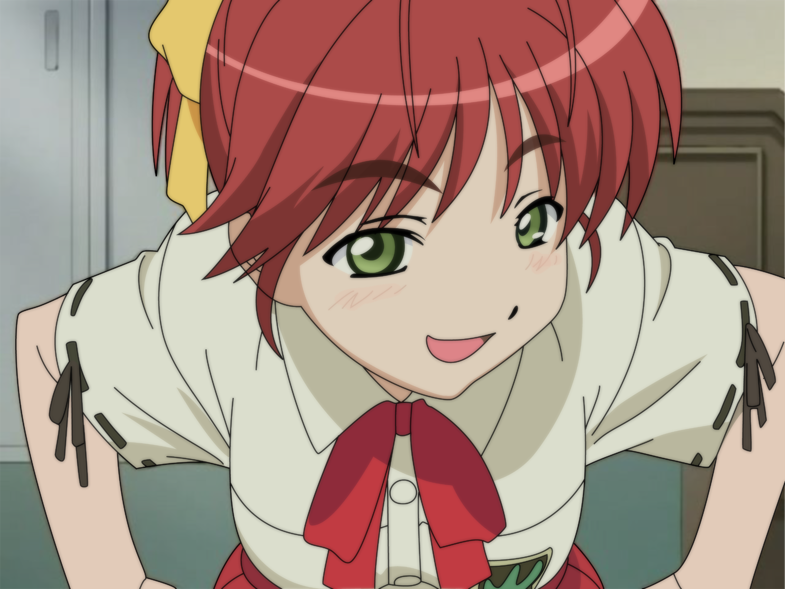 Description: A girl with red hair and green eyes wearing a white shirt and red tie and a red bow tie.