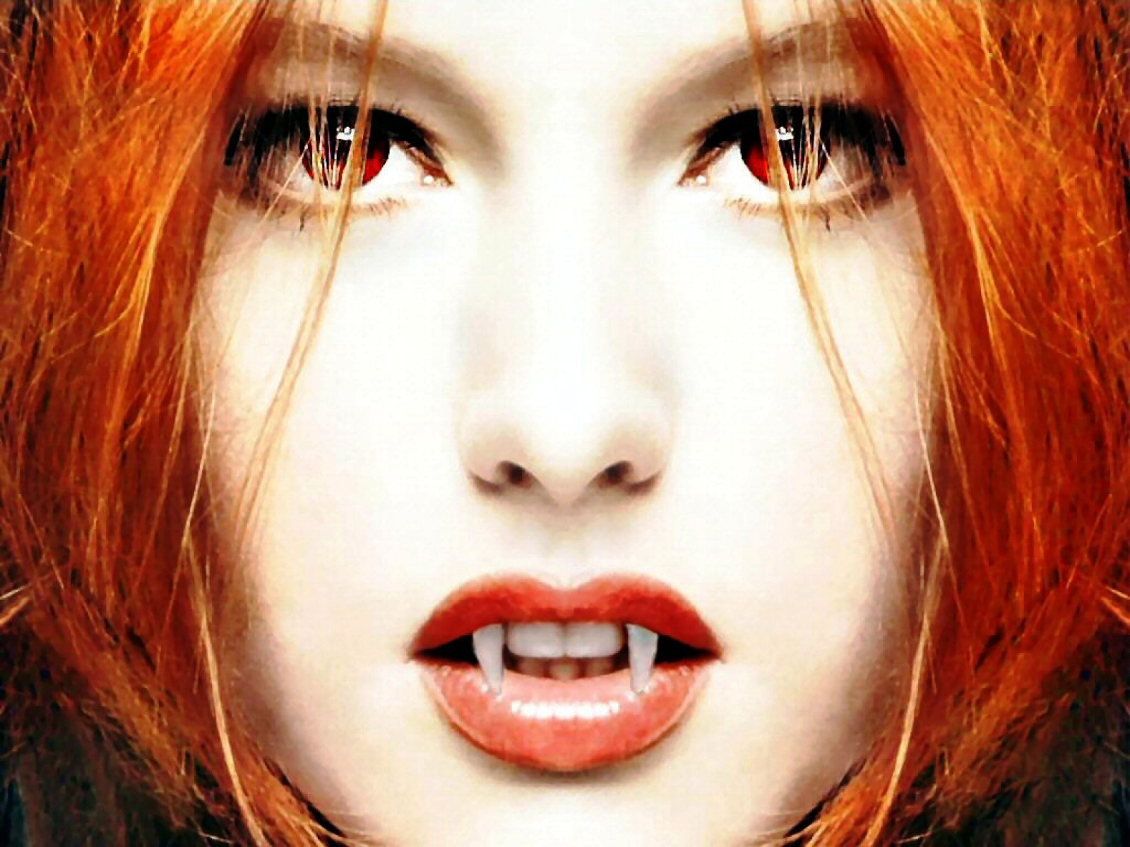 Description: A woman with red hair and a white teeth with a red lip and a black background with a white background.