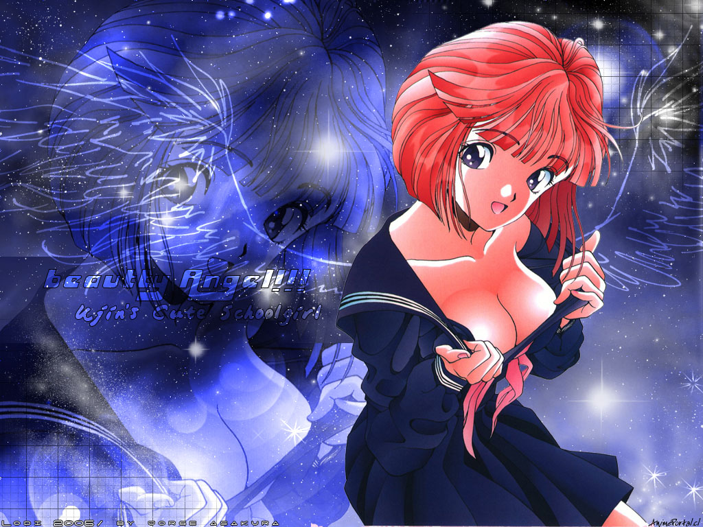 Description: A woman with red hair and a black dress is standing in front of a blue background with stars and a demon.