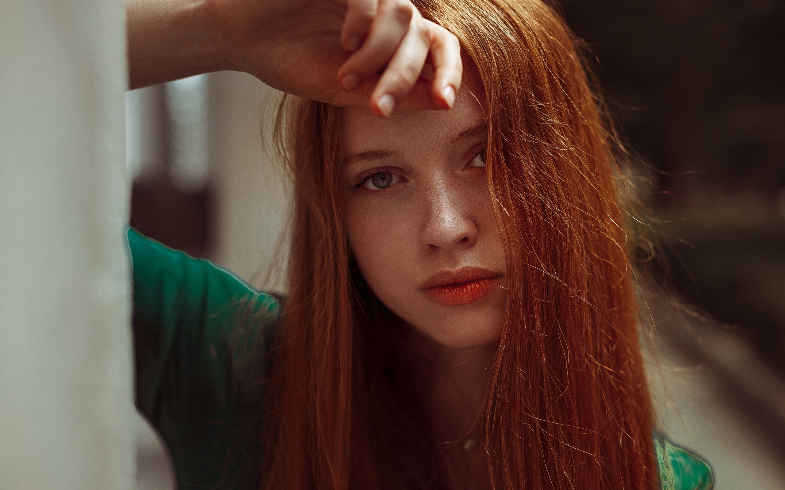 Description: A woman with red hair is looking at the camera and is holding her head up to her side with her hand.