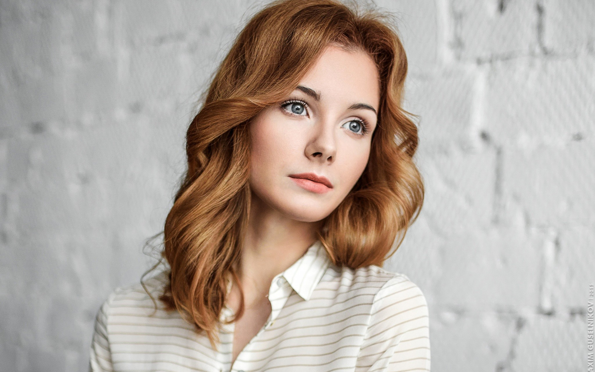 Description: A woman with red hair and a white shirt is posing for a picture with a brick wall behind her.