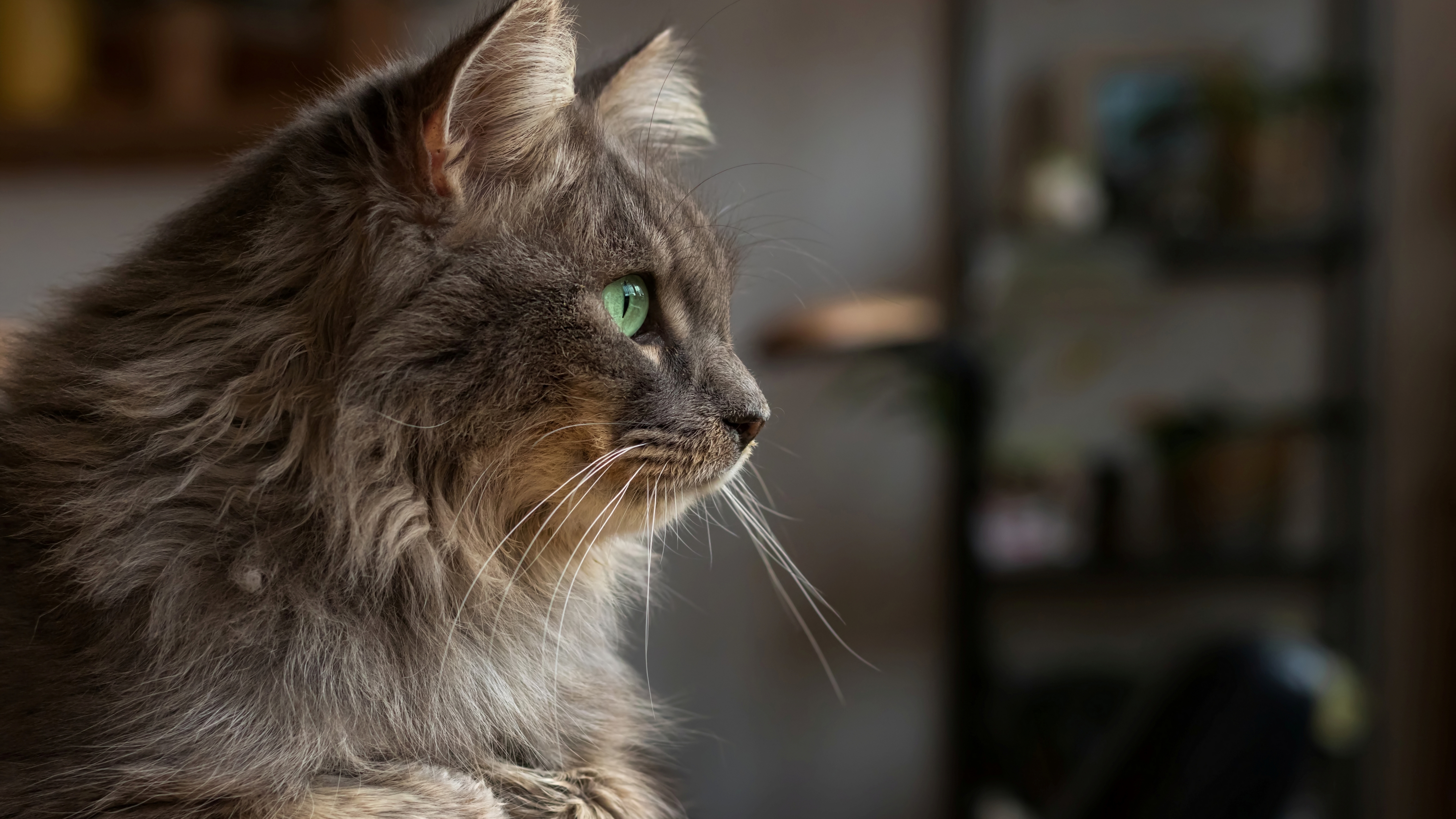 Description: A cat with green eyes sitting on a table looking off into the distance with a blurry background of a shelf.