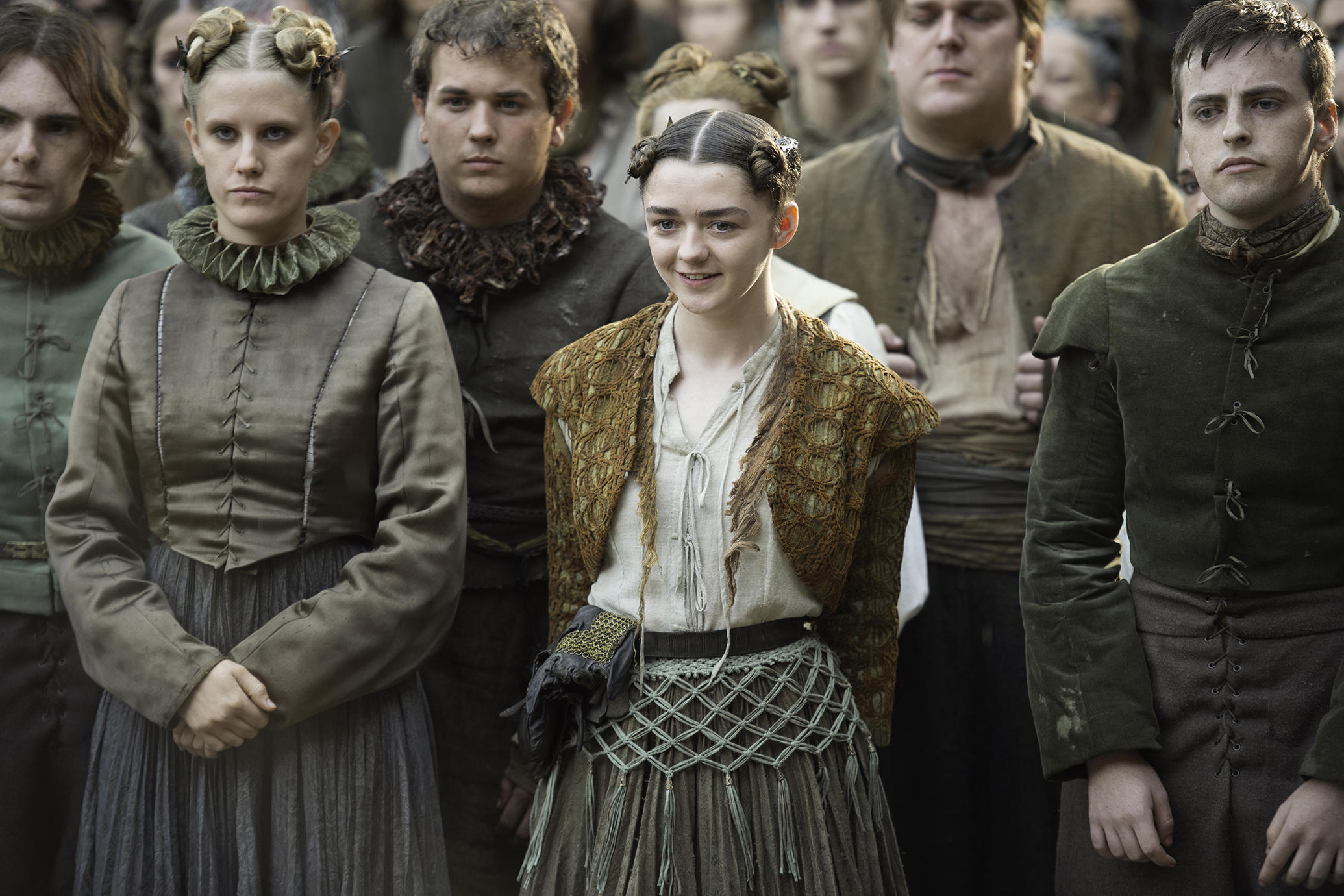 Description: A group of people standing next to each other in a crowd of people in renaissance dress and historical clothing.