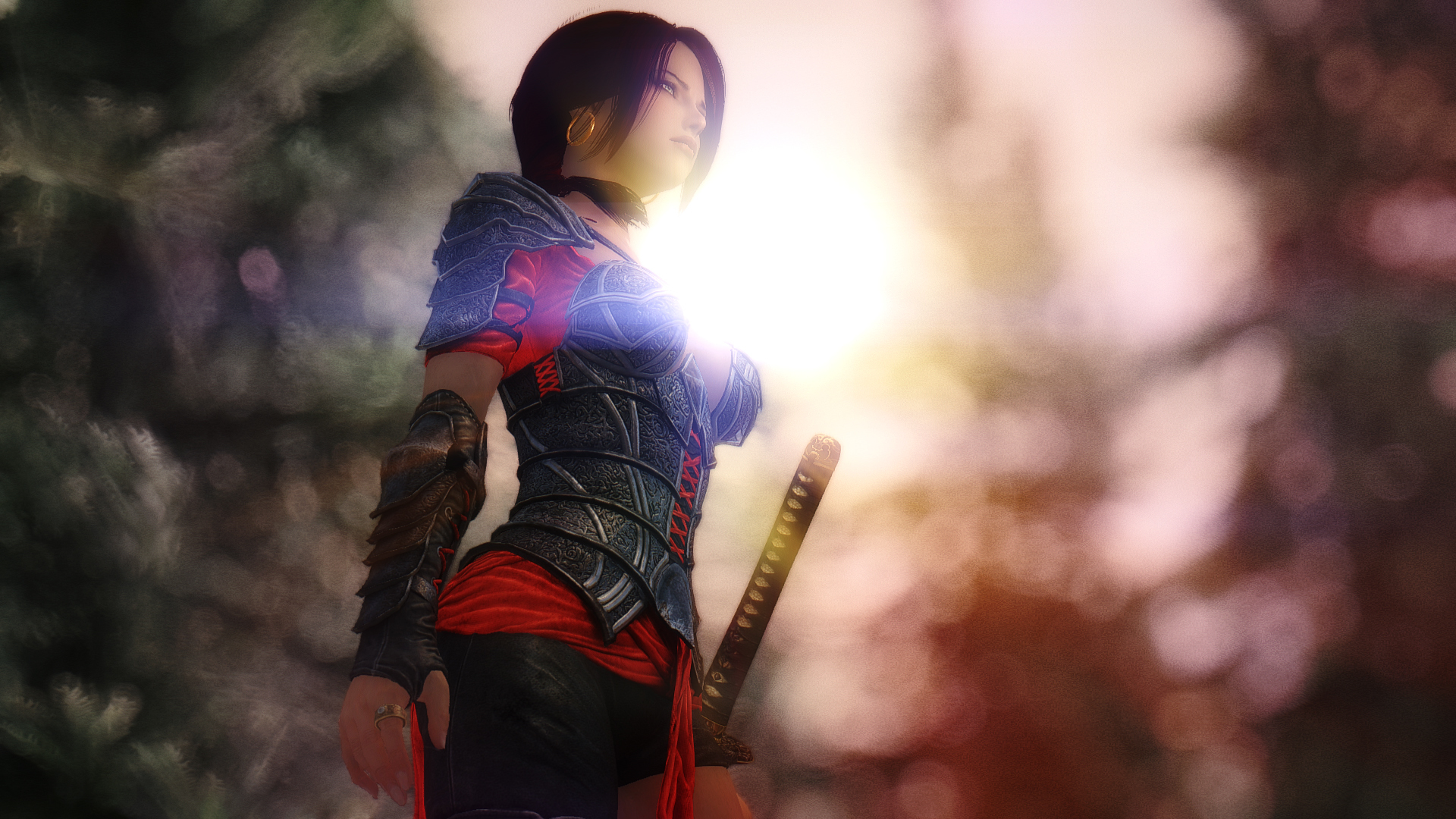 Description: A woman in a red and black outfit holding a sword and a sword case in her hand and a tree in the background.