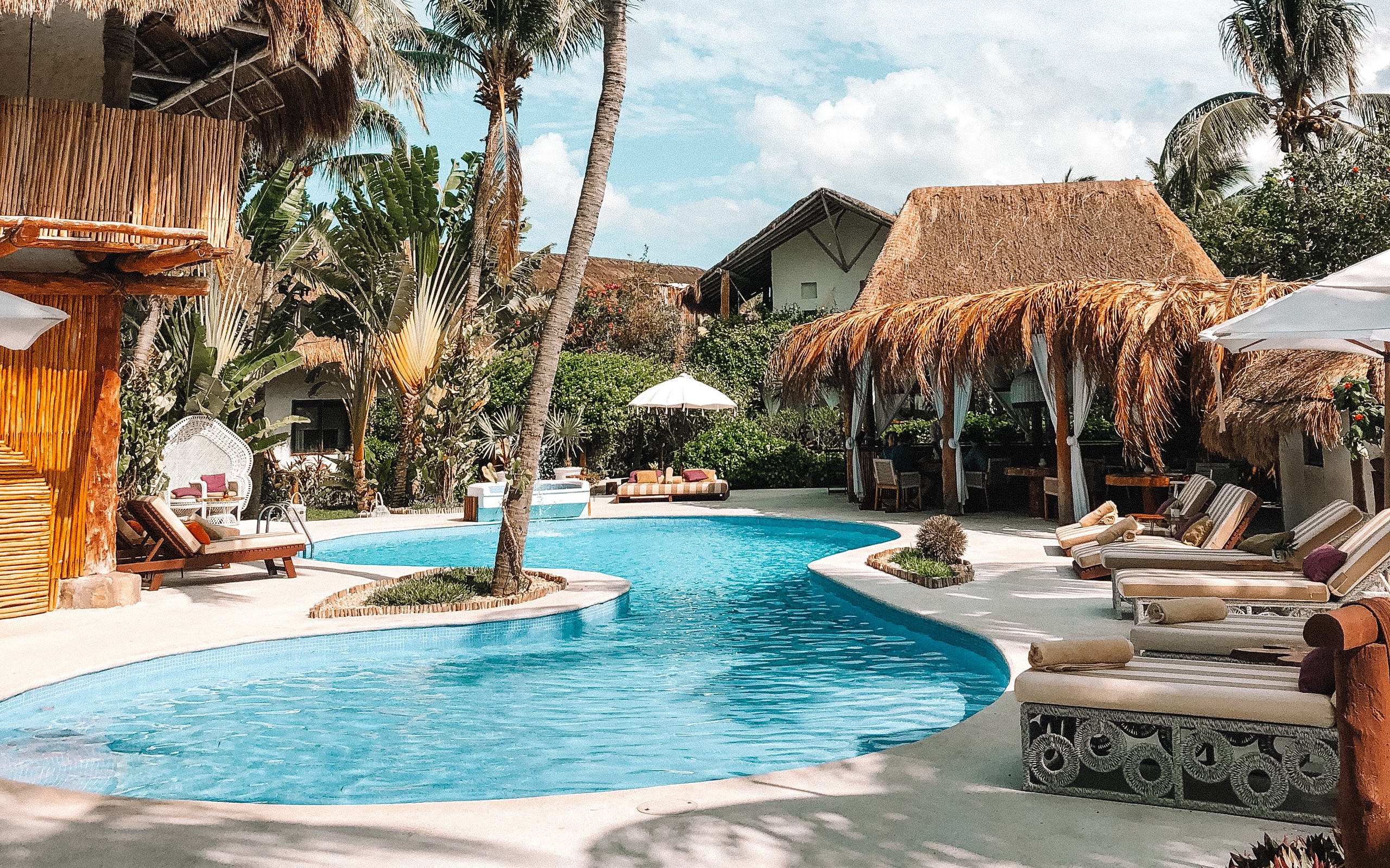 Description: A resort pool with lounge chairs and umbrellas next to it and a thatched roof over the pool.