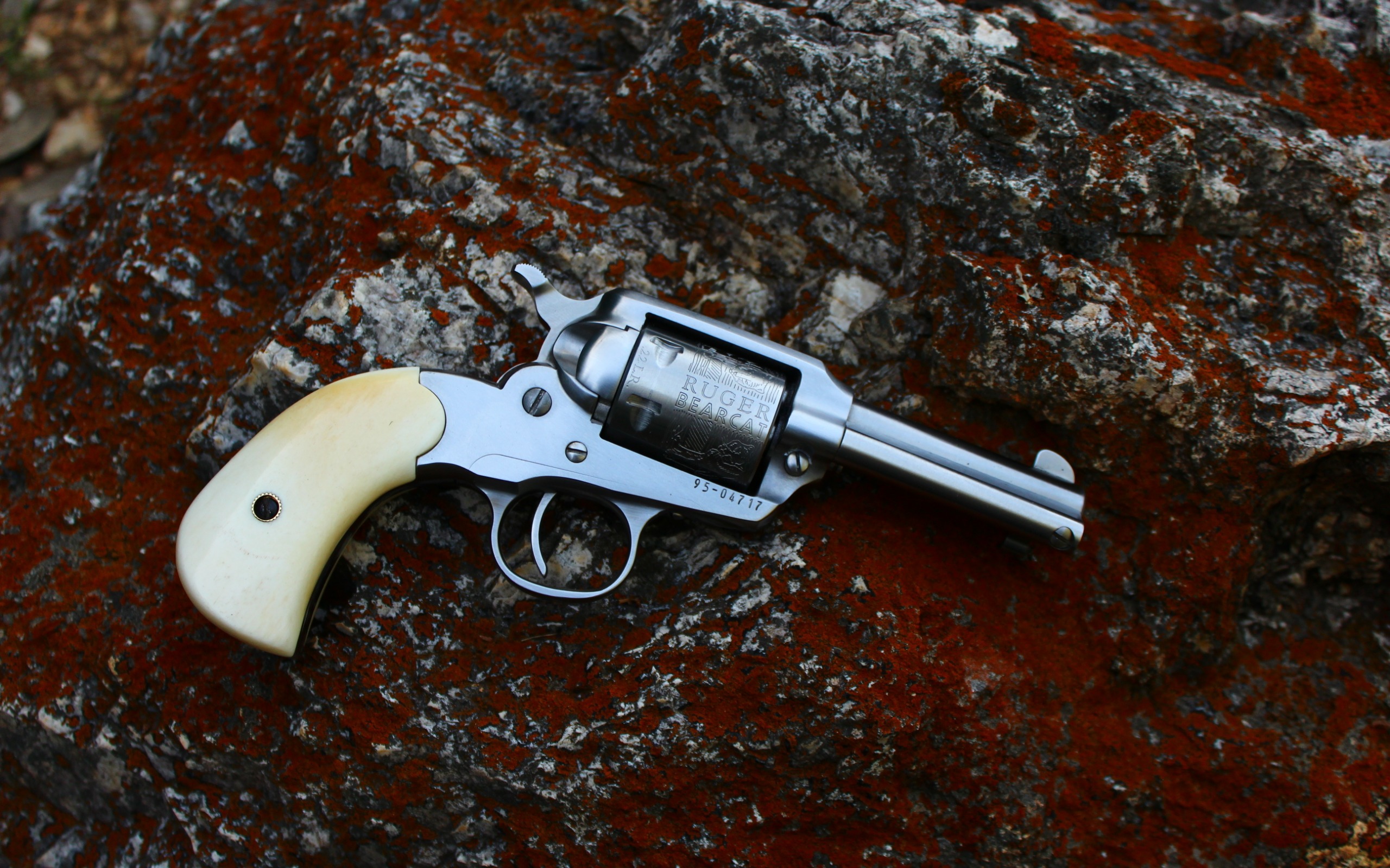 Description: A revolver with a wooden handle on a rock surface with mossy rocks in the background and a red substance.