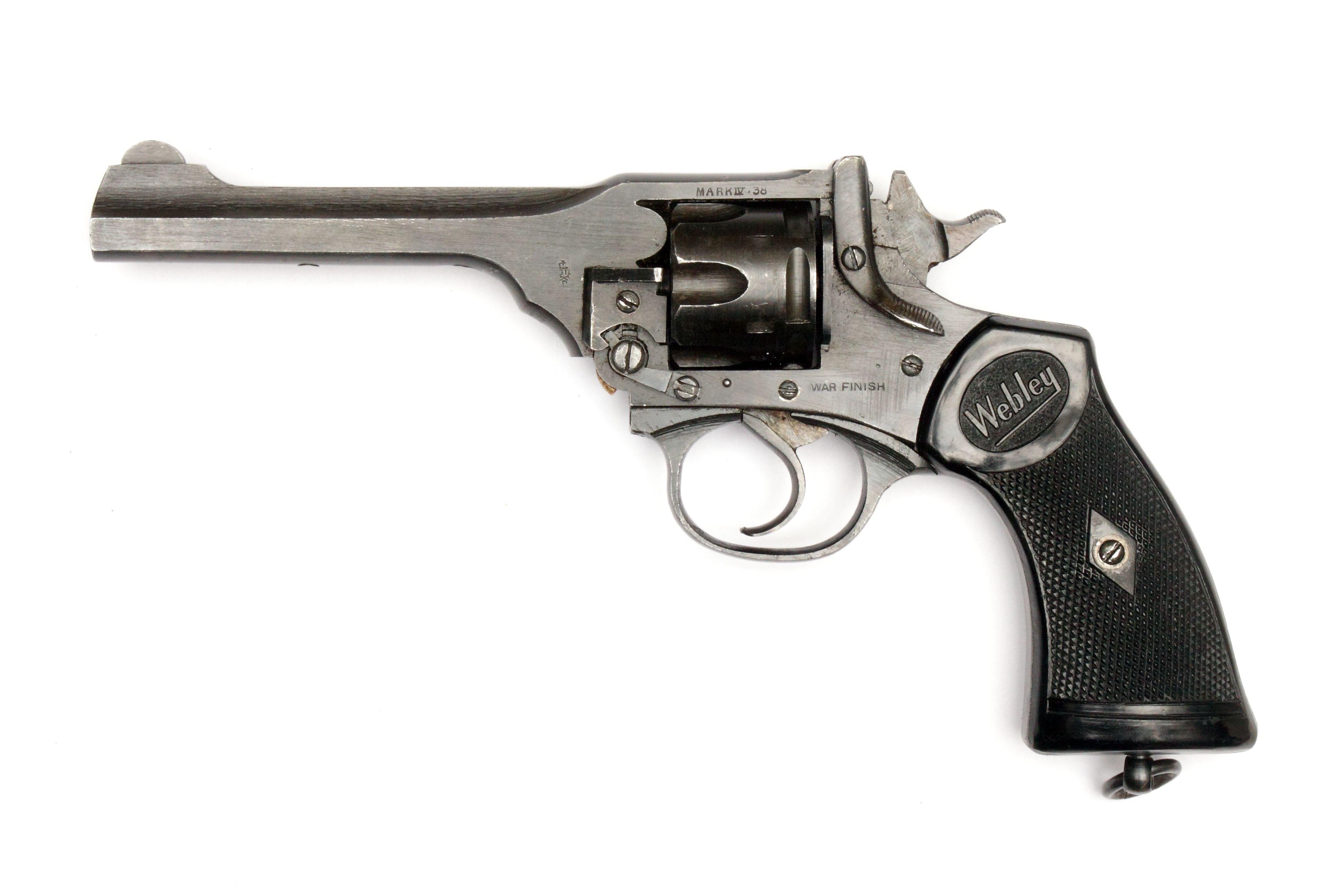 Description: A revolver with a black barrel and a black handle and a black grip and a black trigger on the side.