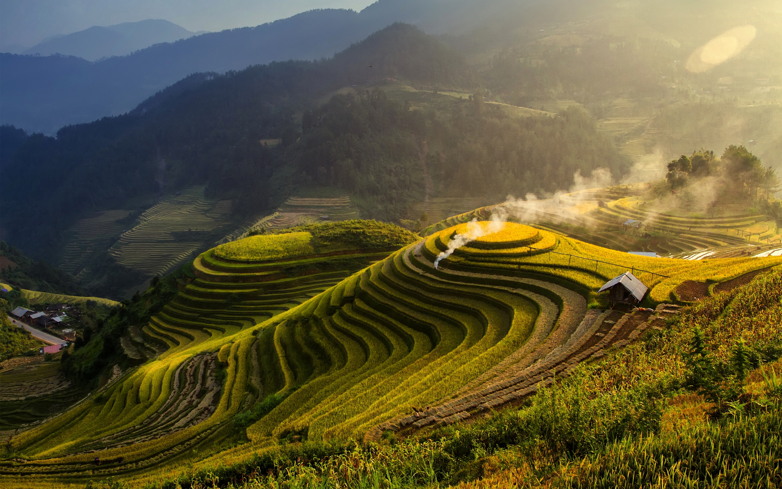 Description: A rice field with a house on the top of it and a mountain in the background with fog in the air.