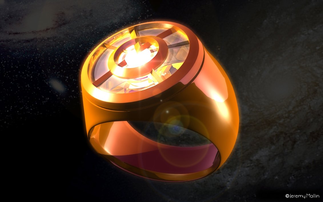Description: A ring with a light on it in the middle of space with a star in the background and a black hole in the middle.