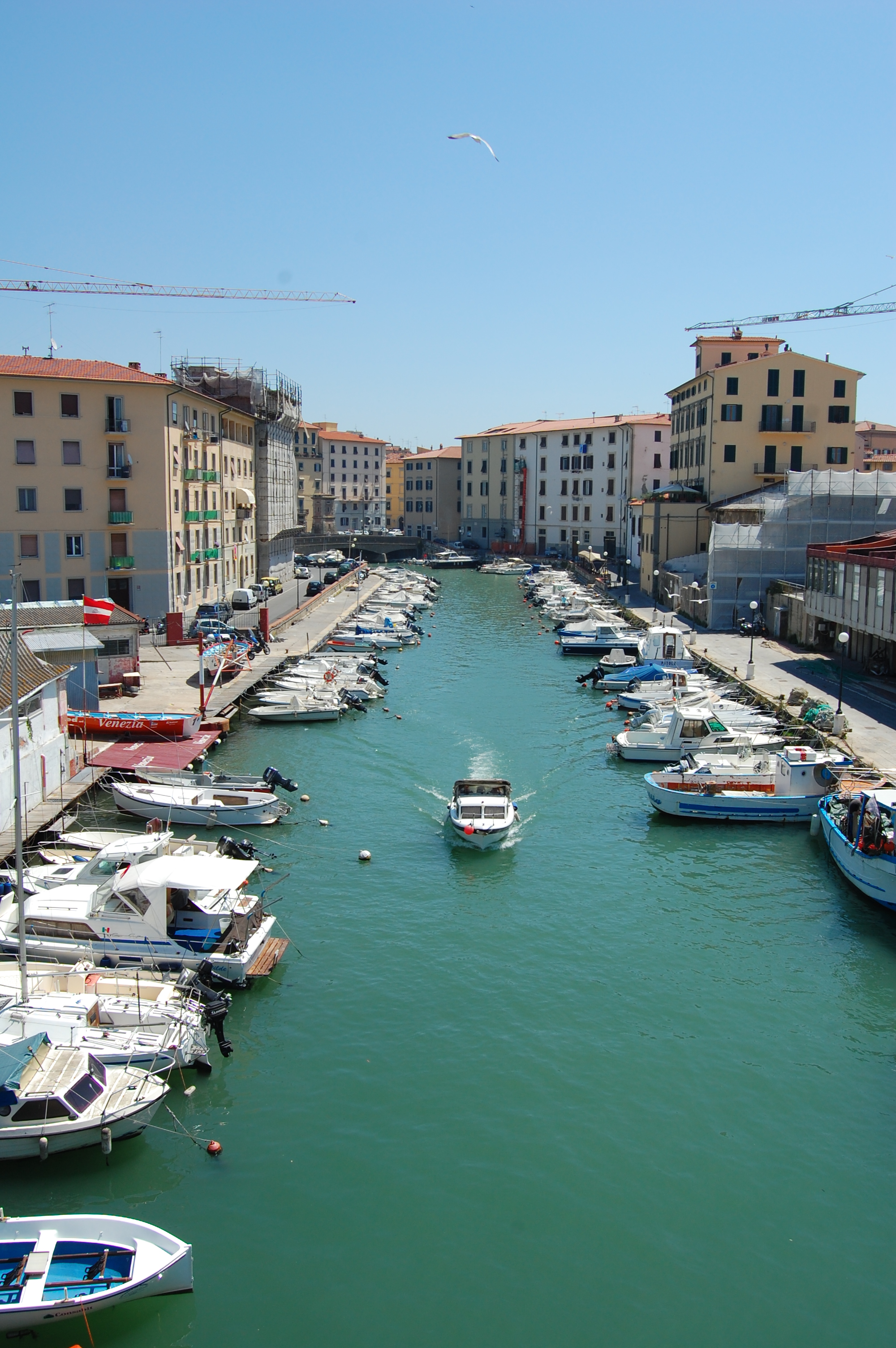 Description: A river with boats in it and buildings in the background and a crane in the sky above it and a few boats in the water below.
