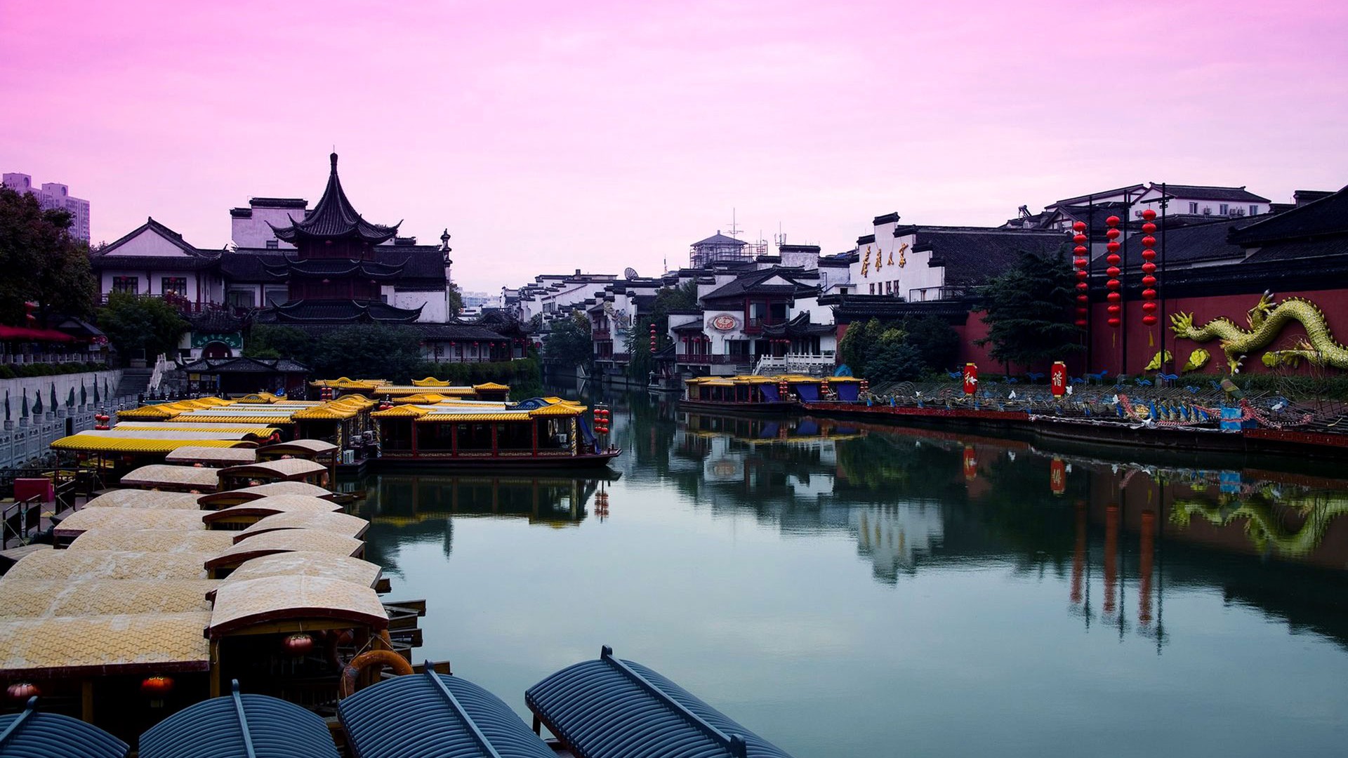 Description: A river with many boats and buildings in the background at dusk with a pink sky above it and a row of yellow umbrellas on the side.