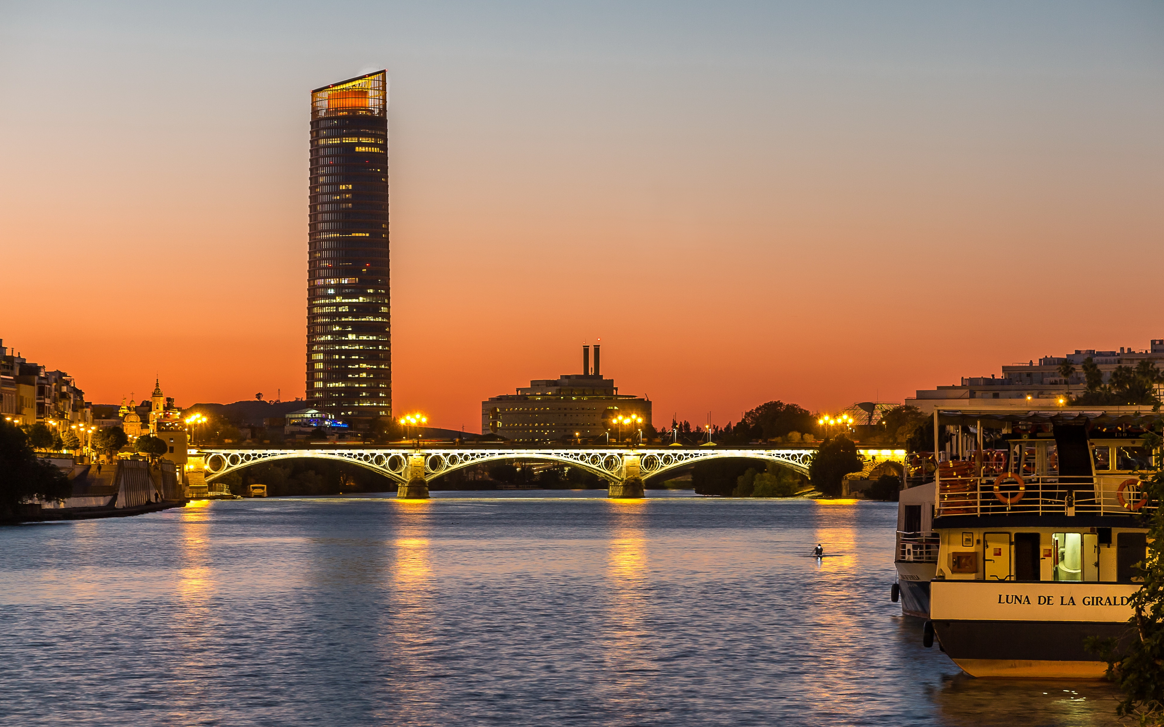 Description: A river with a bridge and a building in the background at sunset or dawn with a boat in the foreground.
