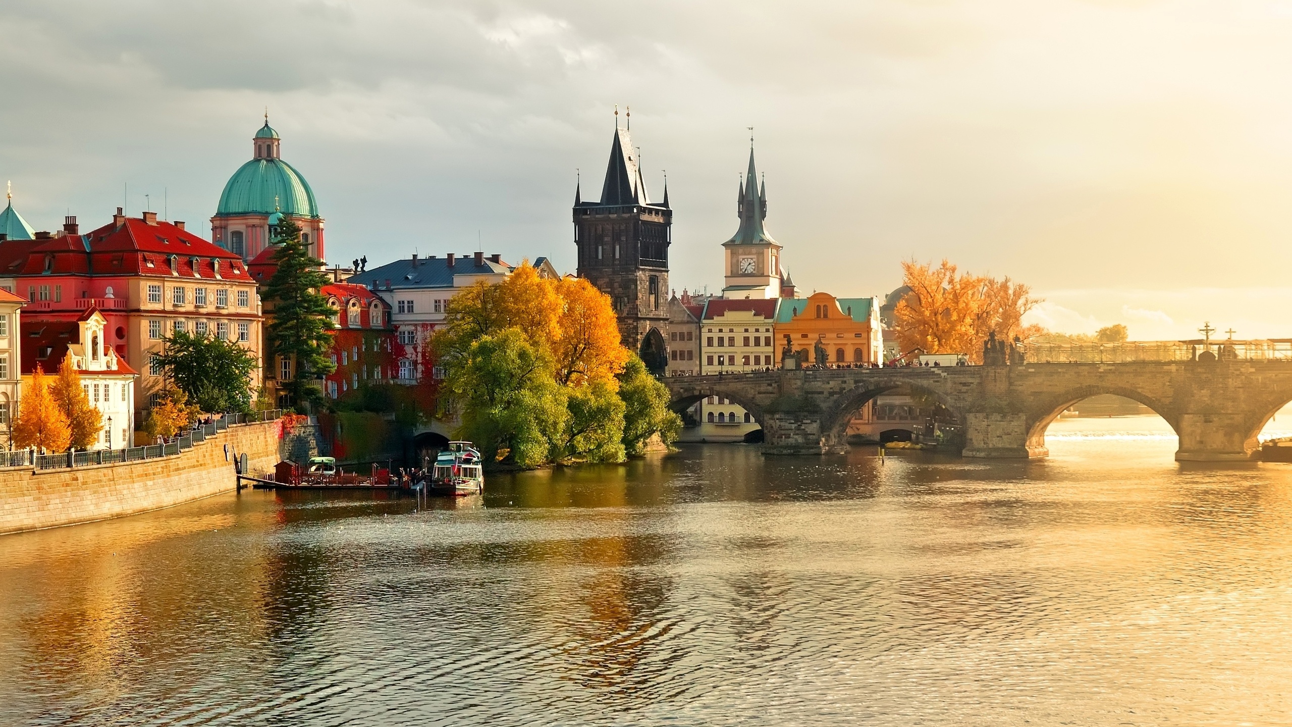 Description: A river with a bridge and a few buildings on it and a bridge in the background with a few boats on it.