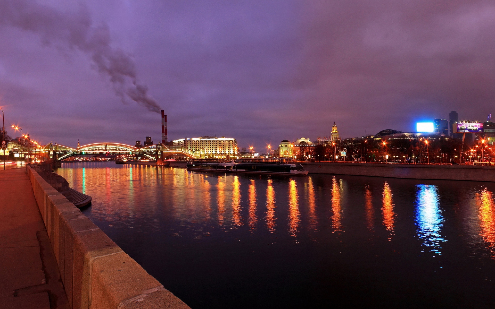 Description: A river with a bridge and a city in the background at night time with lights on the water and a few buildings.