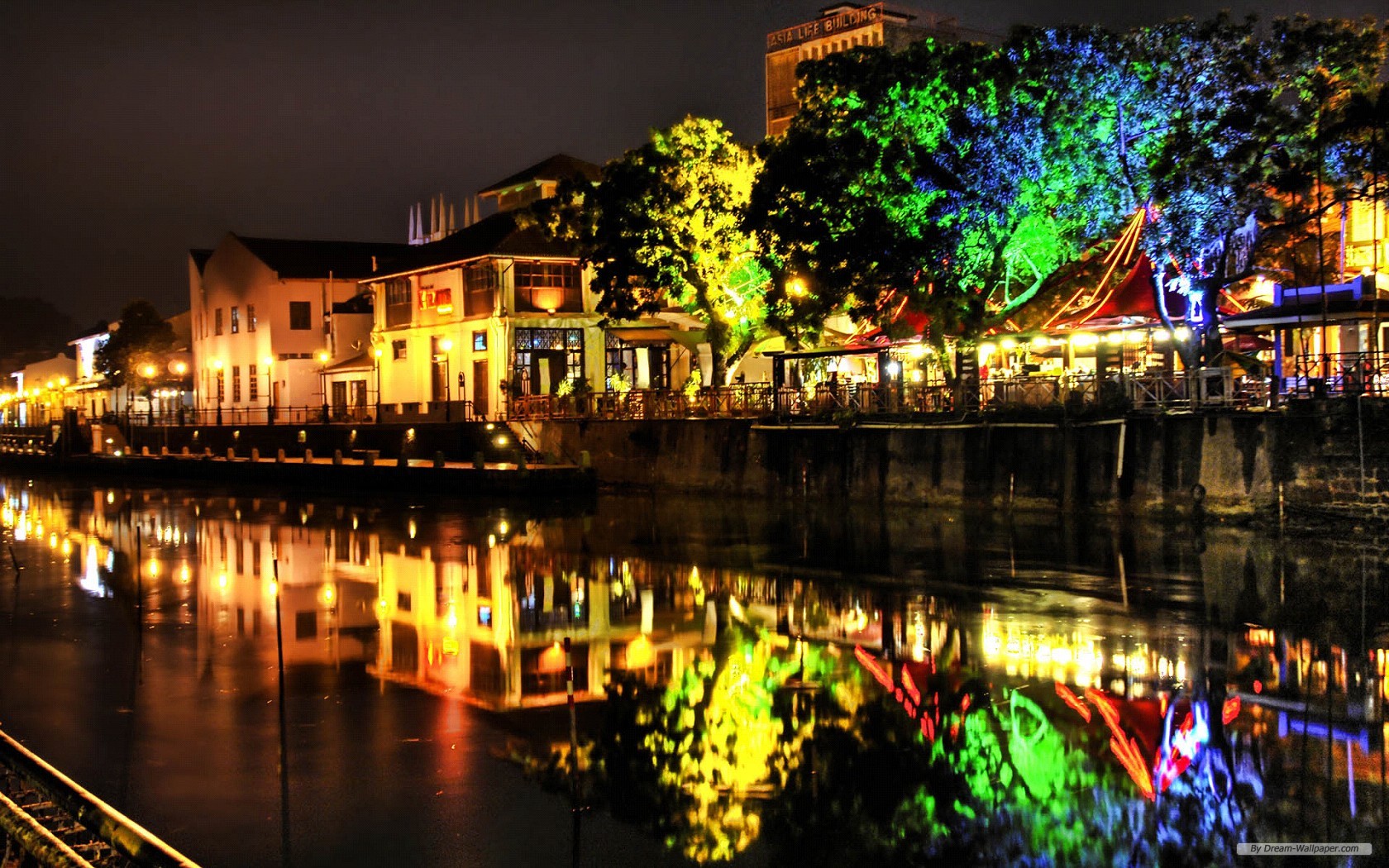 Description: A river with a bunch of buildings on it at night time with lights on the buildings and trees reflecting in the water.
