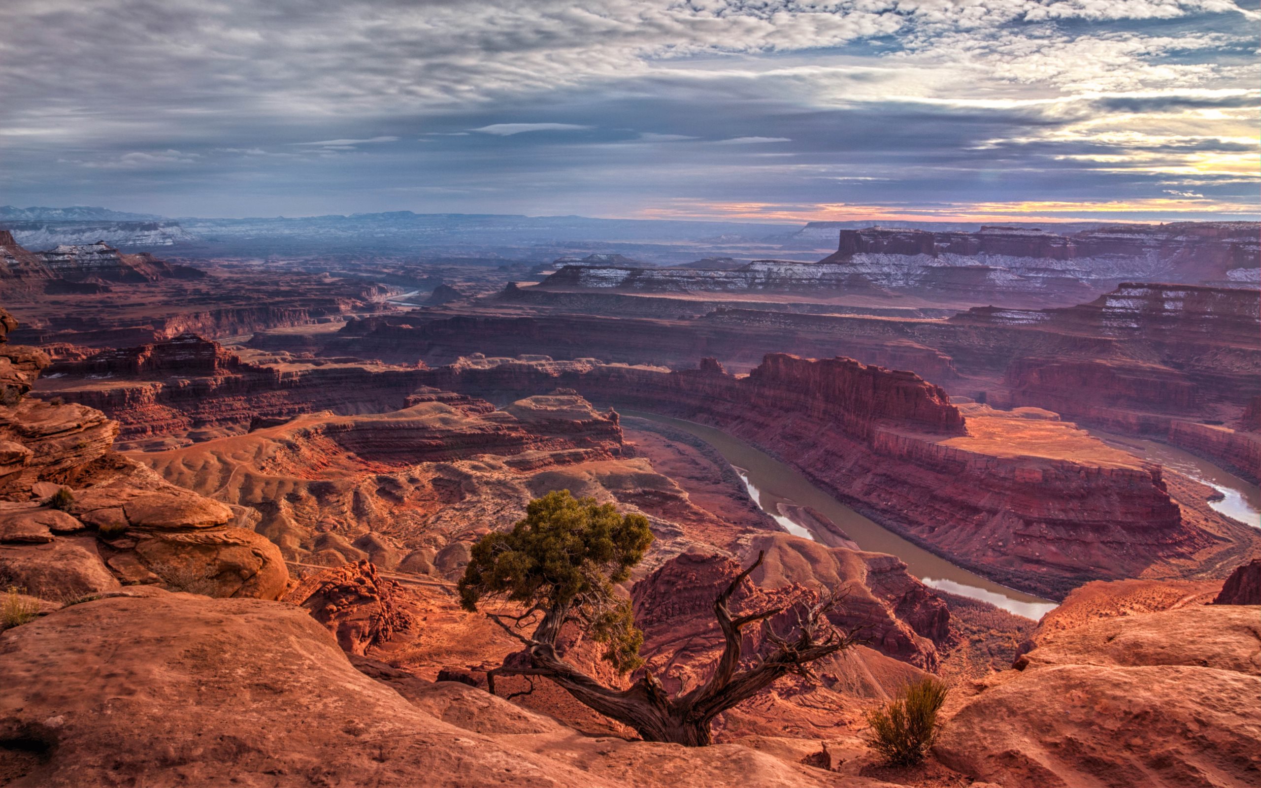 Description: A view of a river in a canyon with a cloudy sky above it and a tree in the foreground.