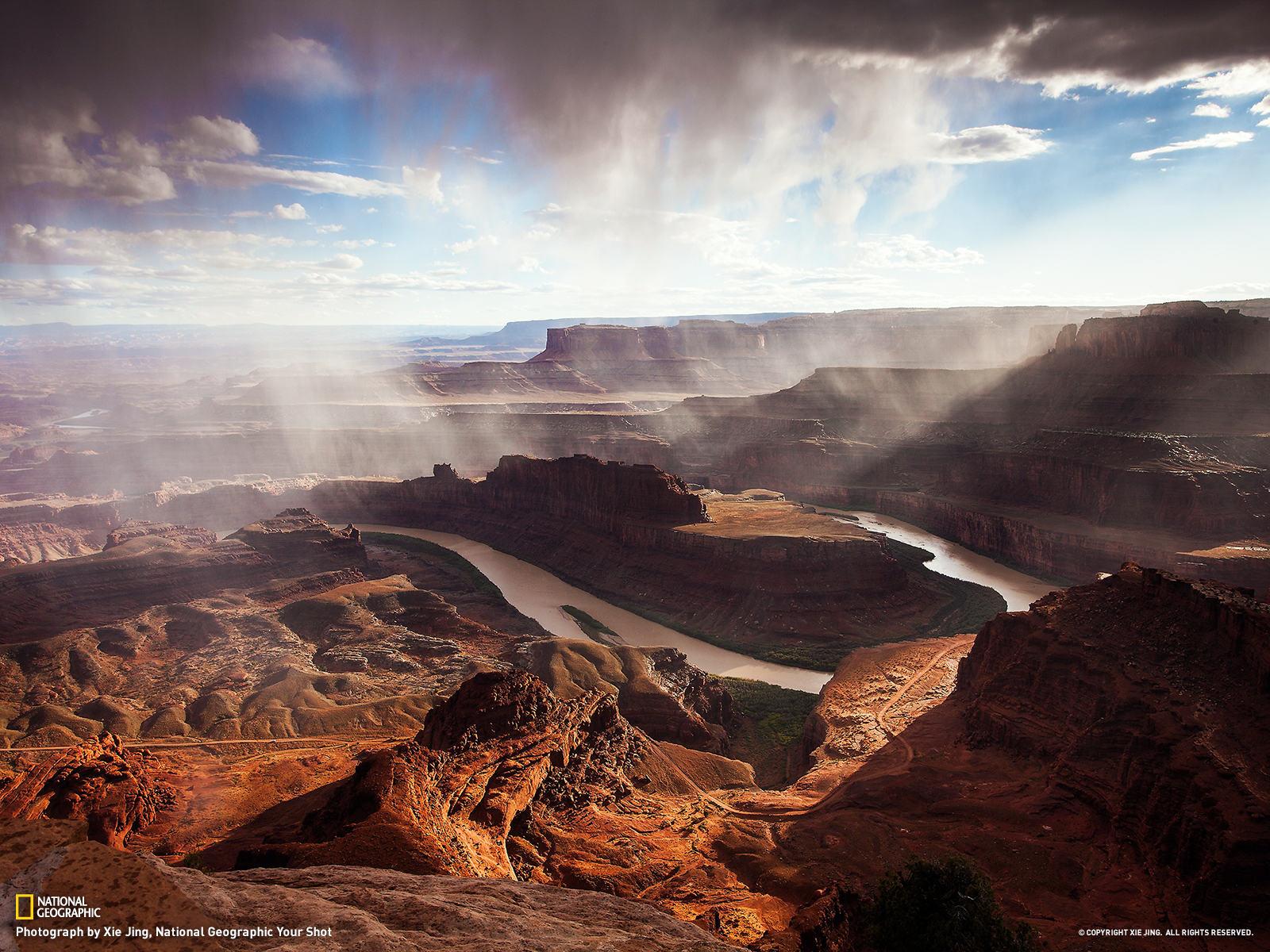 Description: A river flowing through a canyon surrounded by mountains and clouds in the sky with a sunbeam in the distance.