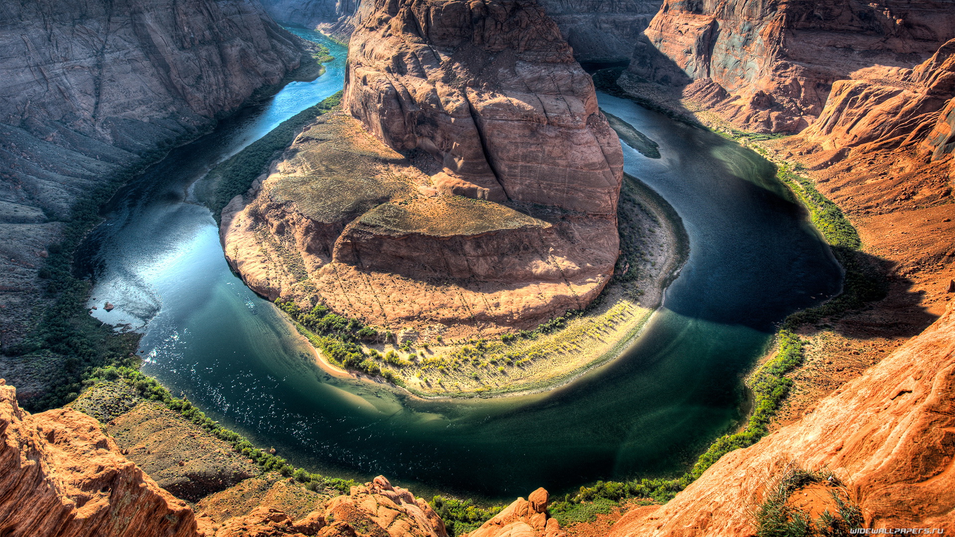 Description: A river flowing through a canyon surrounded by mountains and rocks in the desert.