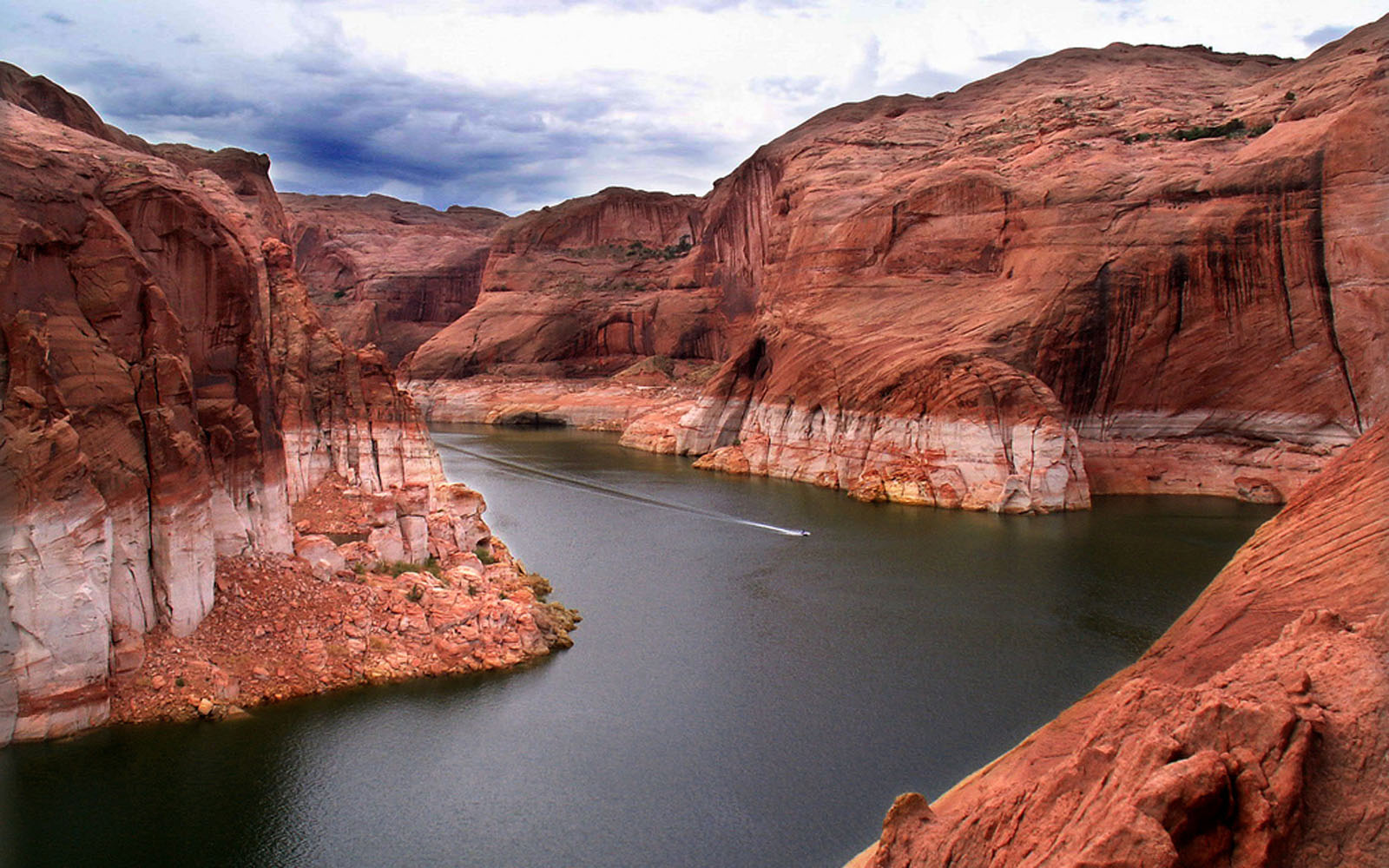 Description: A river in a canyon surrounded by red rocks and a cloudy sky above it is a boat in the water.