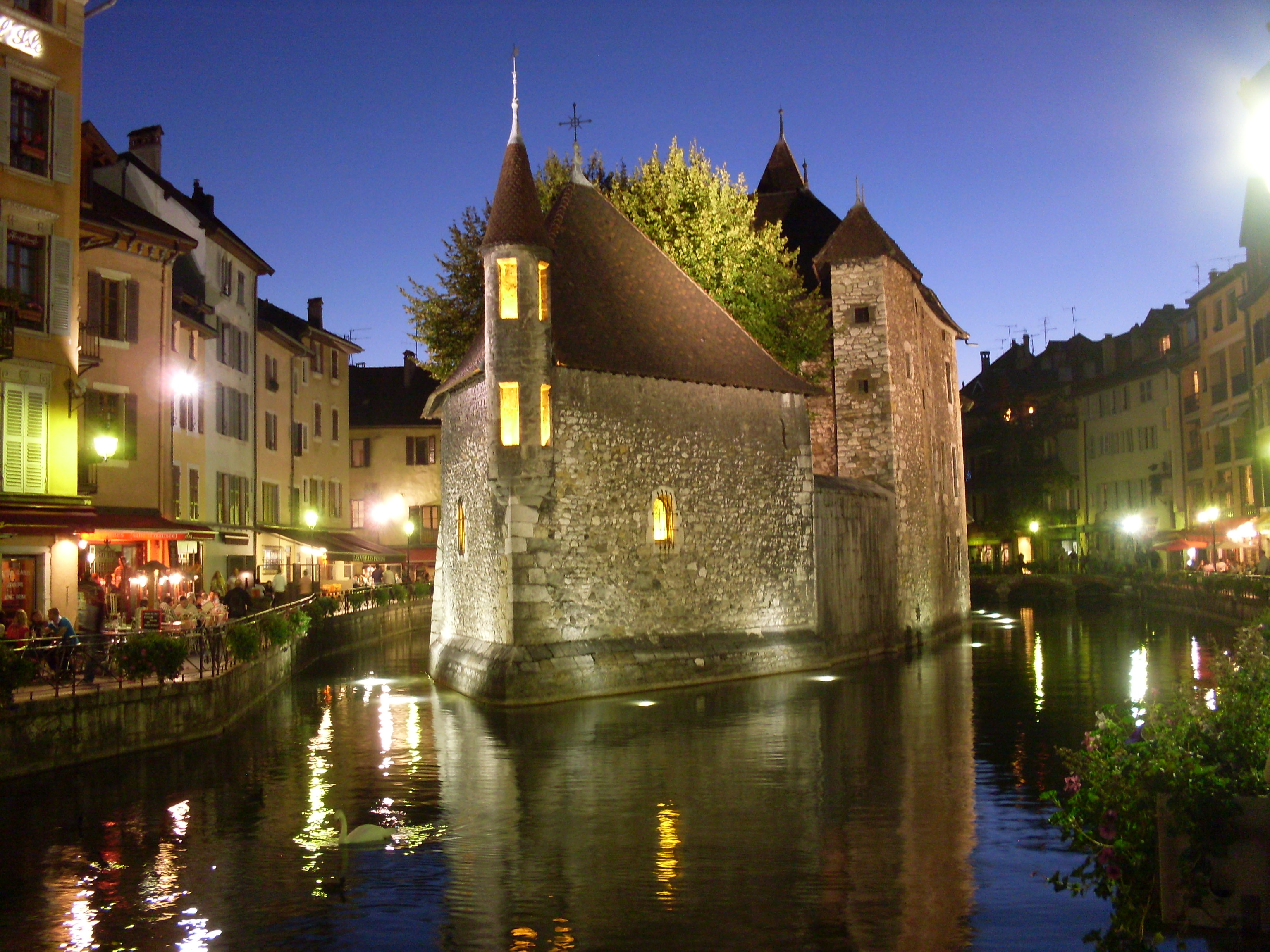 Description: A river running through a city next to tall buildings at night time with lights on the buildings and people walking on the sidewalk.