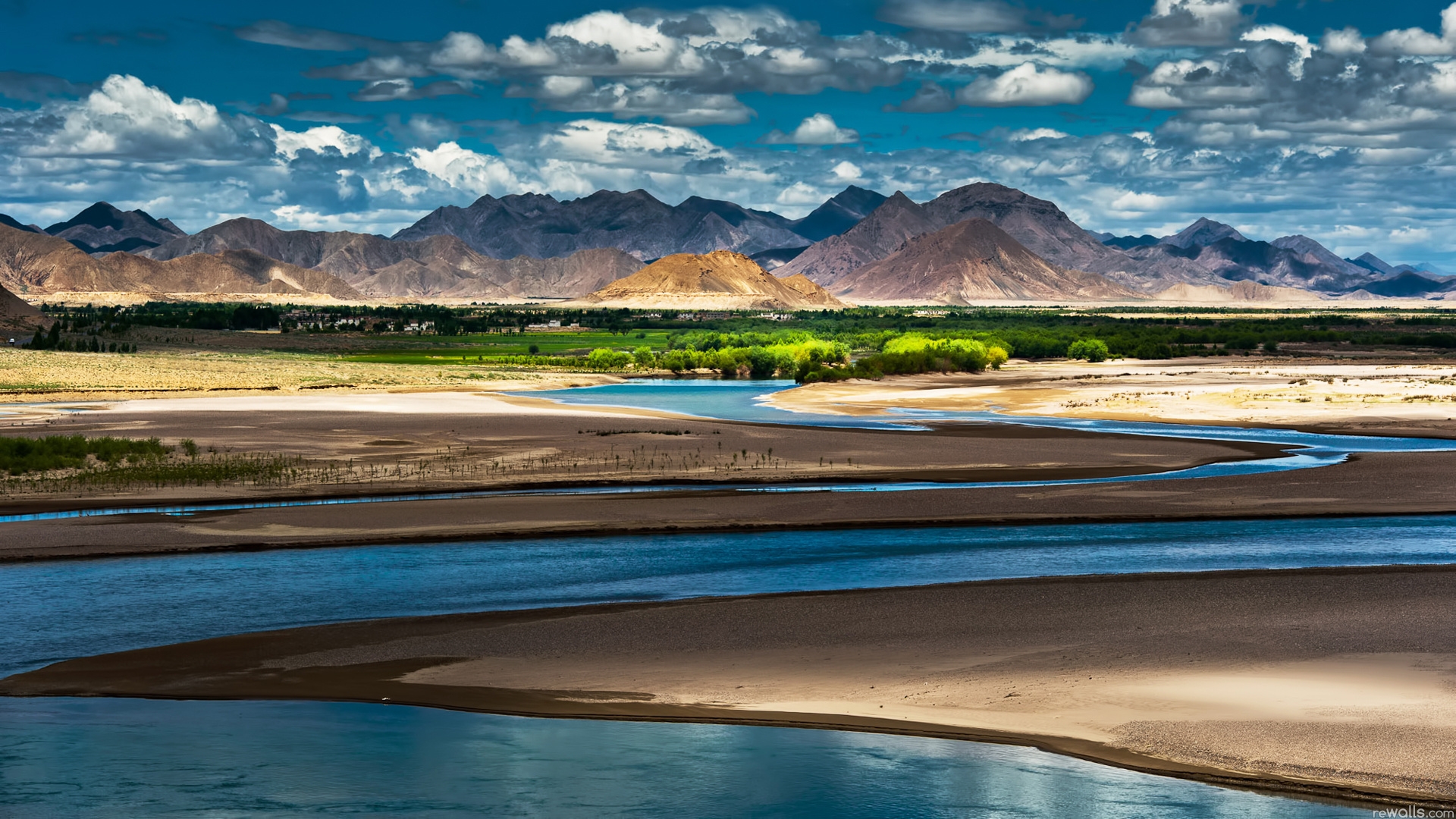 Description: A river running through a desert landscape under a cloudy sky with mountains in the background and a blue sky with clouds.