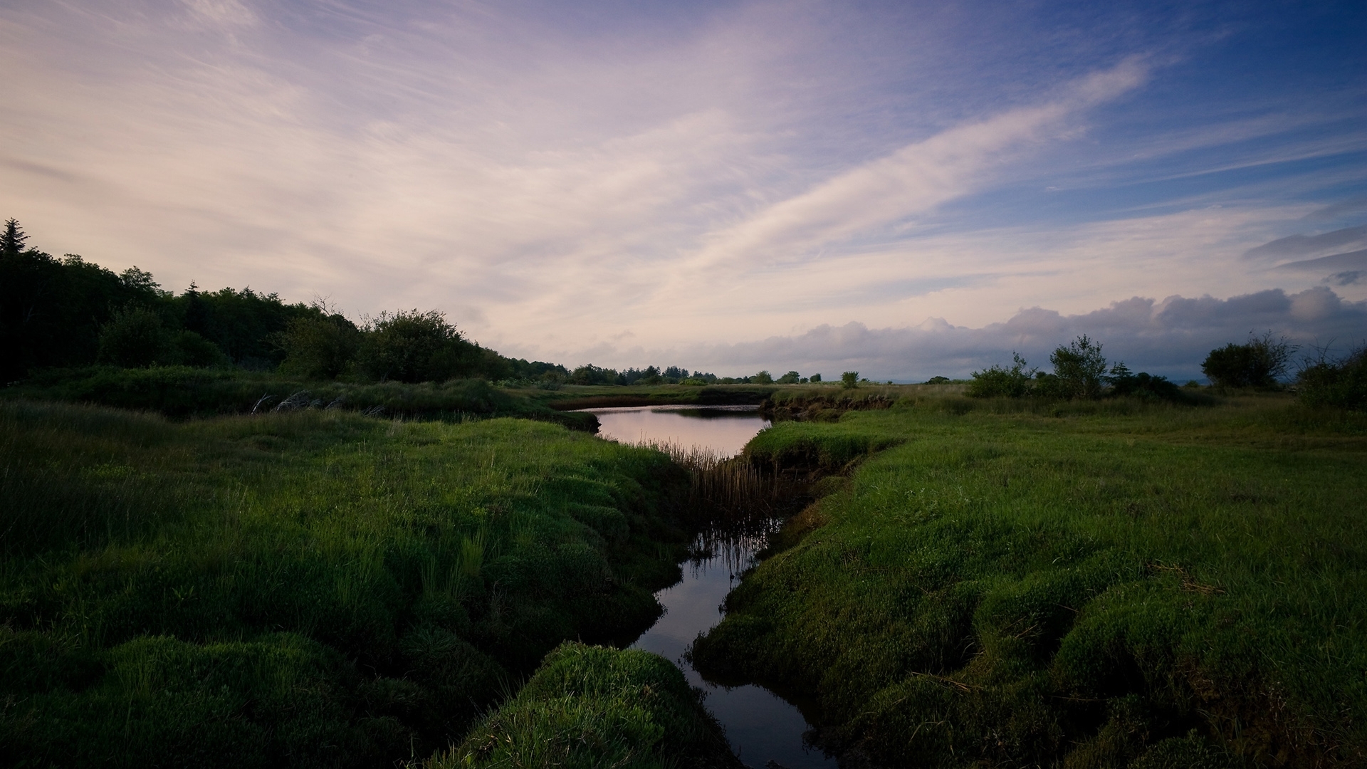 Description: A river running through a lush green field under a cloudy sky with clouds in the sky above it and a small pond in the middle.